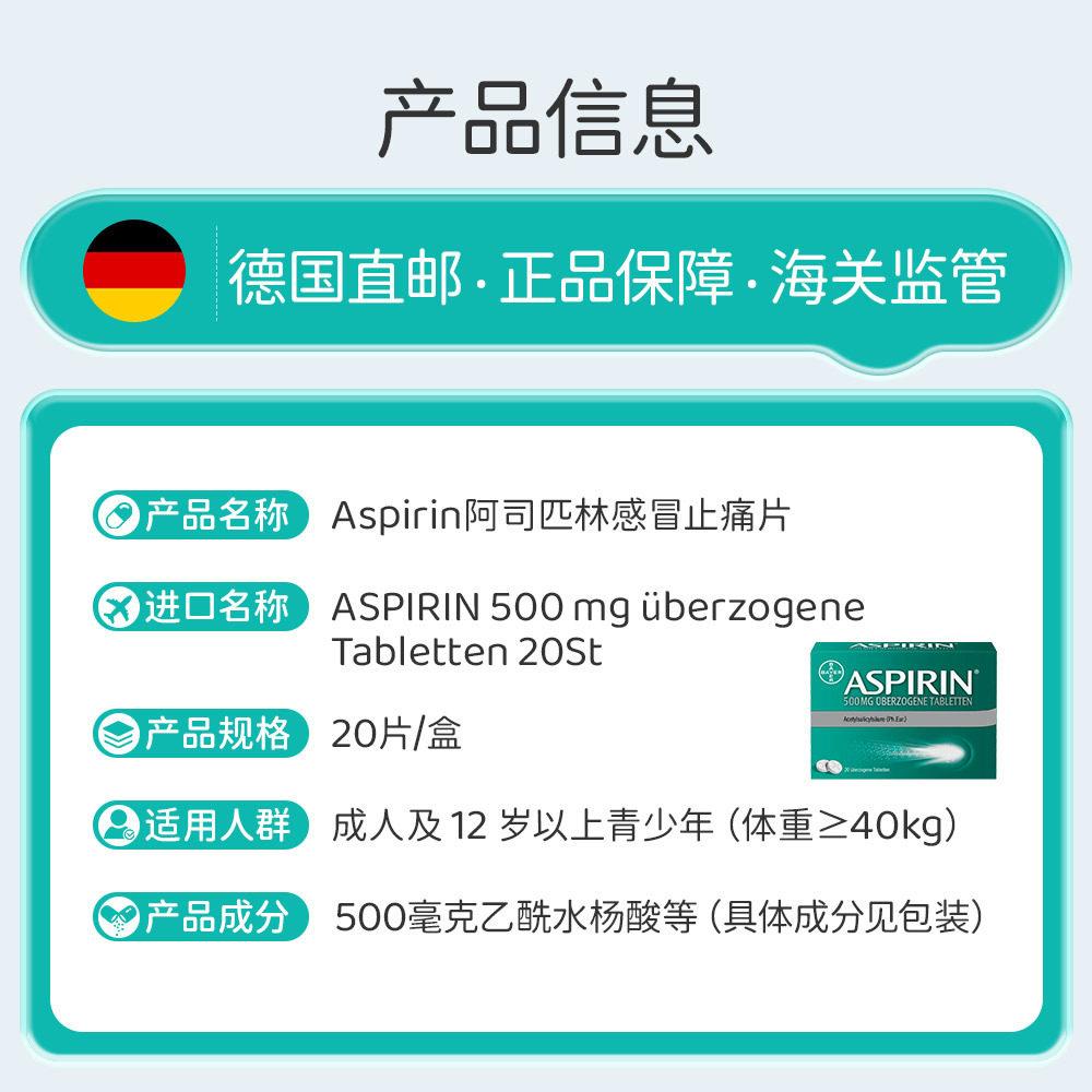 📚 欧洲直邮Aspirin阿司匹林感冒止痛片500mg乙酰水杨酸20片头痛发烧