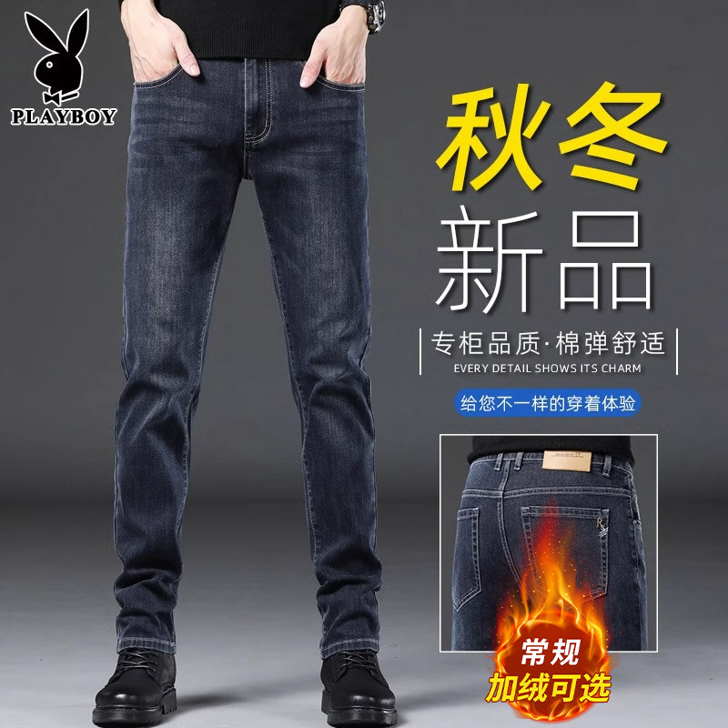 📚 花花公子秋冬牛仔裤男士直筒宽松弹力长裤加绒加厚商务休闲裤子男