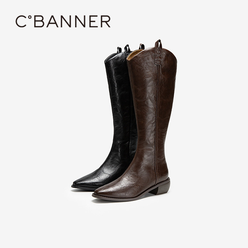 📚 千百度手抓皮中跟骑士靴女2025冬季新款尖头粗跟增高瘦瘦靴长靴子