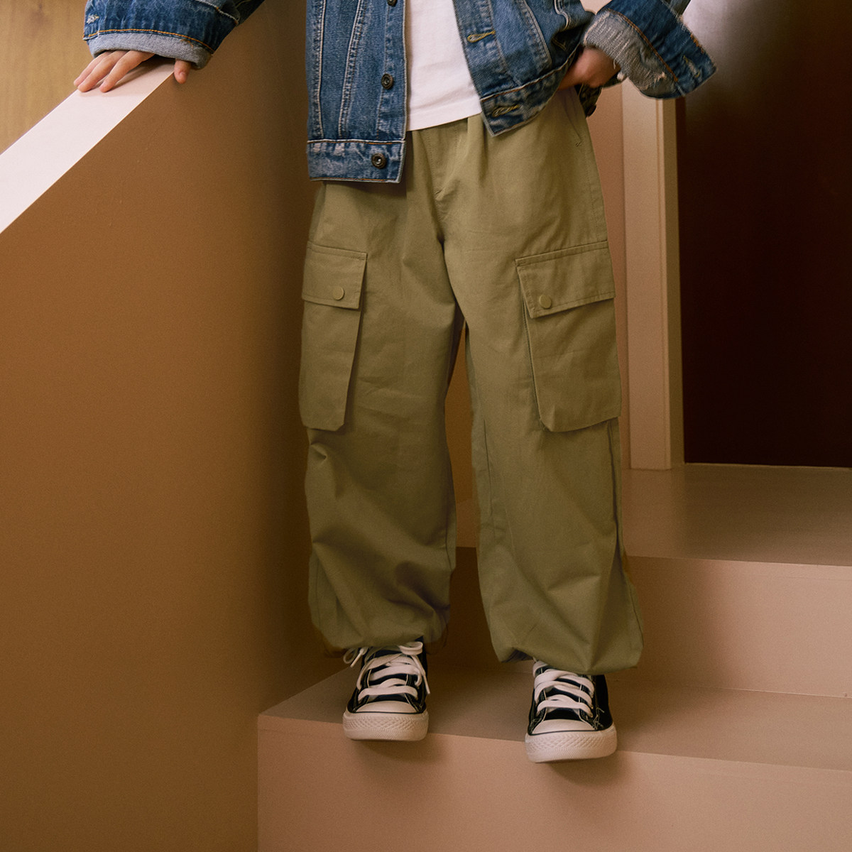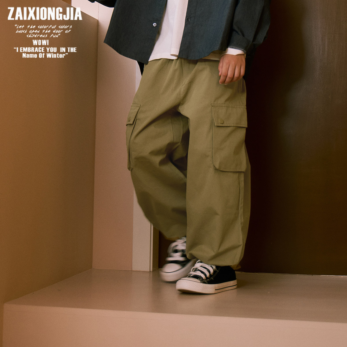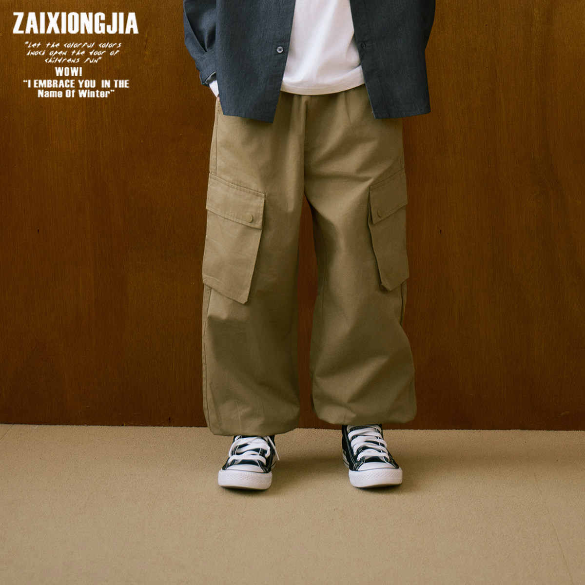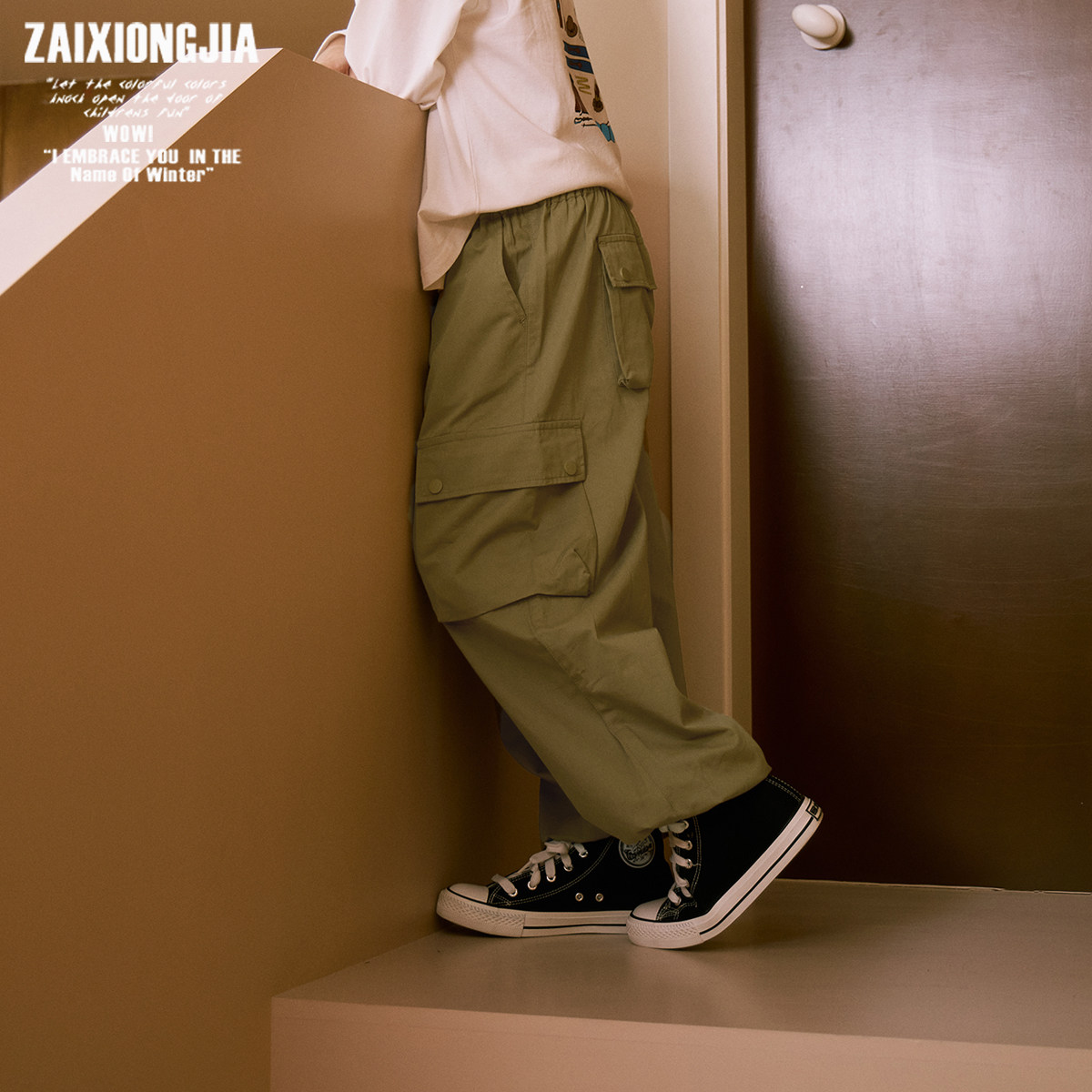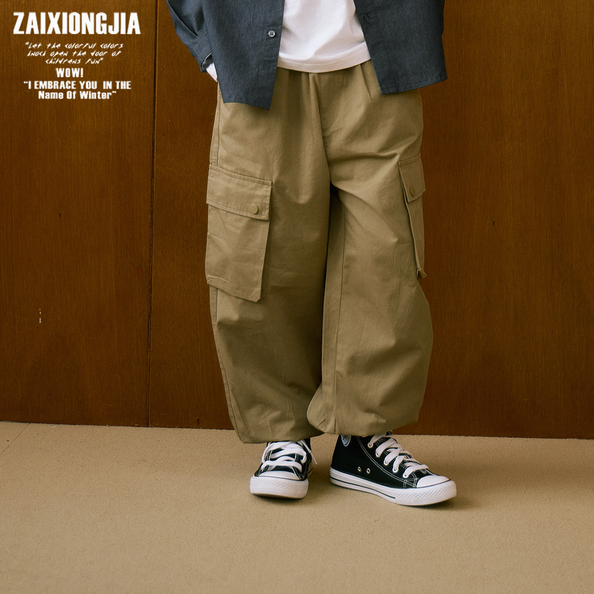 📚 后口袋装饰休闲卡其工装束脚裤男女童装松紧腰幼儿园长裤棉裤子