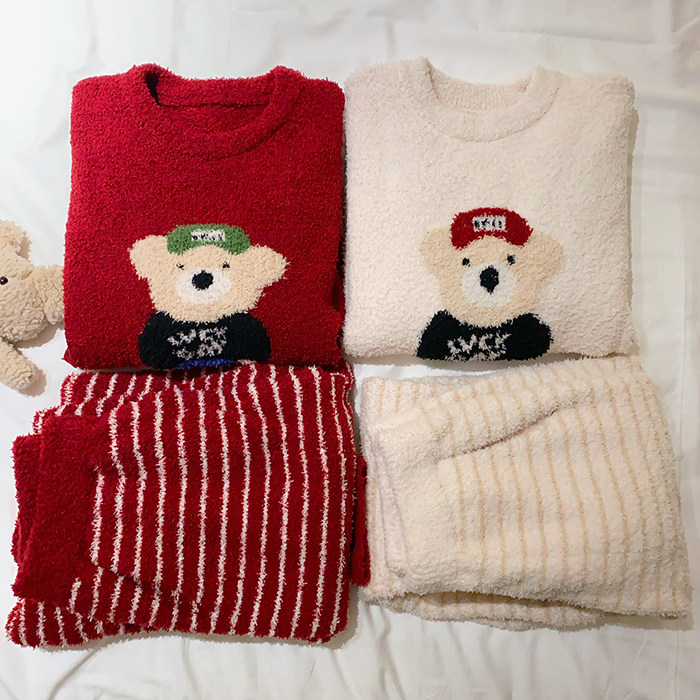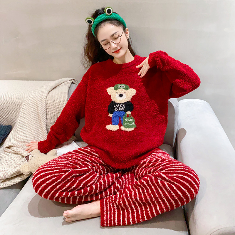 📚 新年圣诞红色睡衣女冬季加厚保暖甜美可爱小熊珊瑚绒半边绒家居服