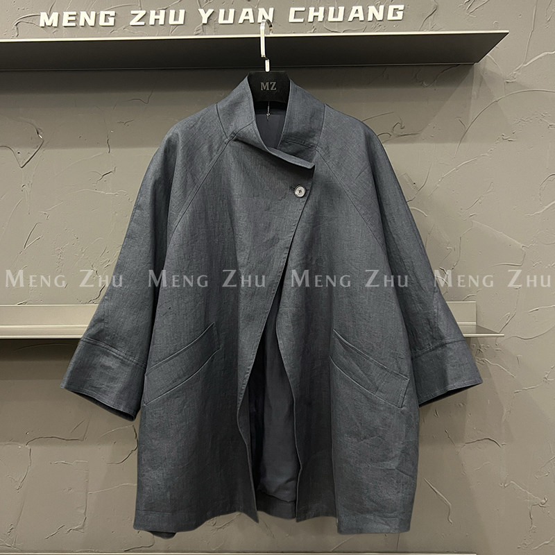 📚 高端欧货2025秋季新款休闲立领一粒扣设计感七分袖亚麻风衣外套女