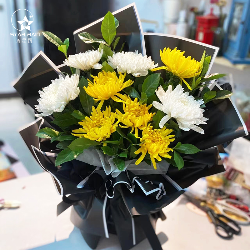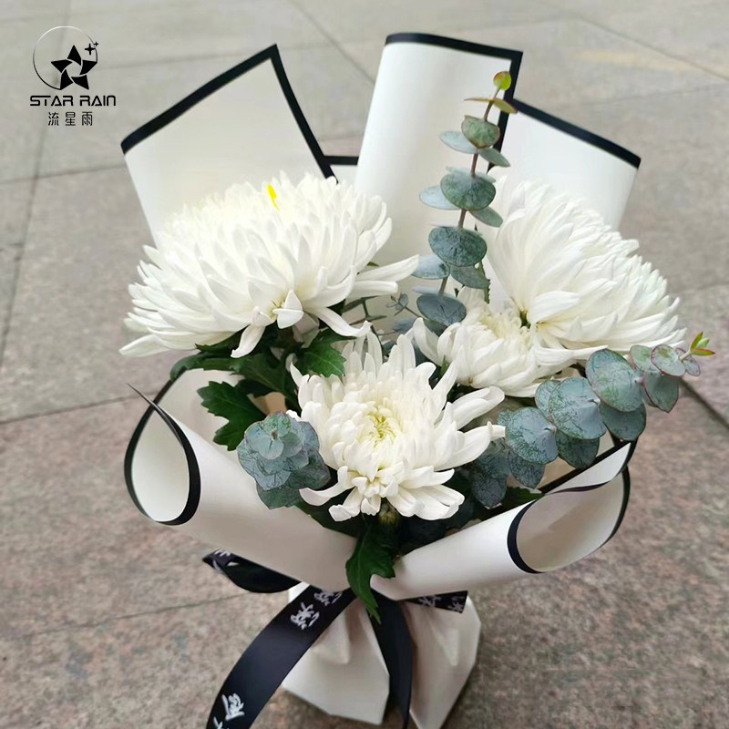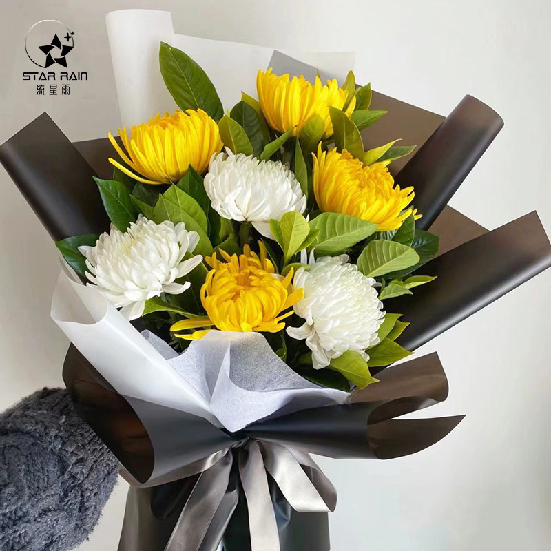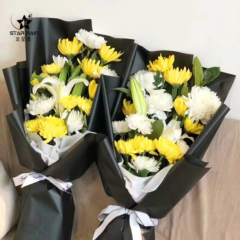 📚 流星雨清明节黑白贵族菊花鲜花花束包装纸黑色防水包花纸花艺材料