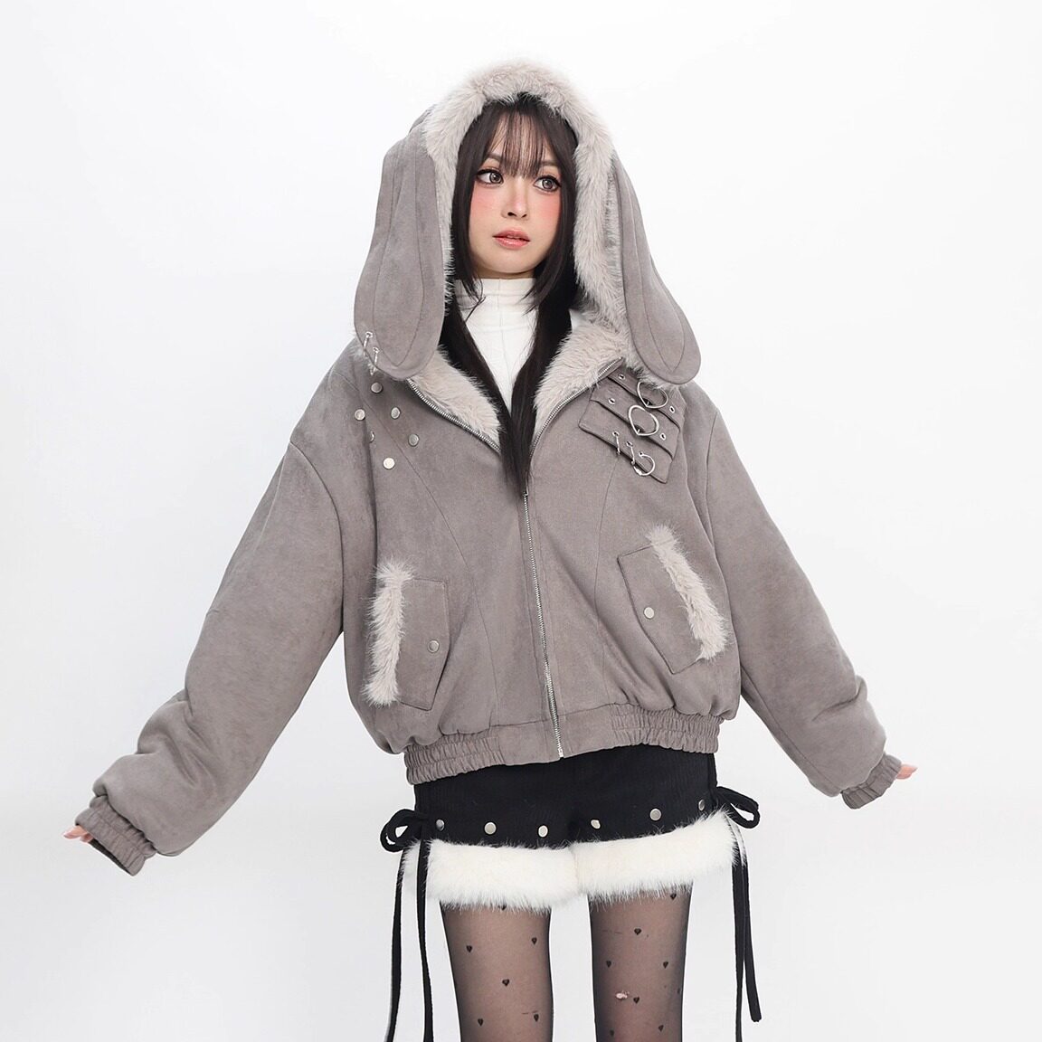 📚 猫愿原创【雾灰雪兔】座山雕飞行夹克加厚保暖毛绒宽松连帽外套女