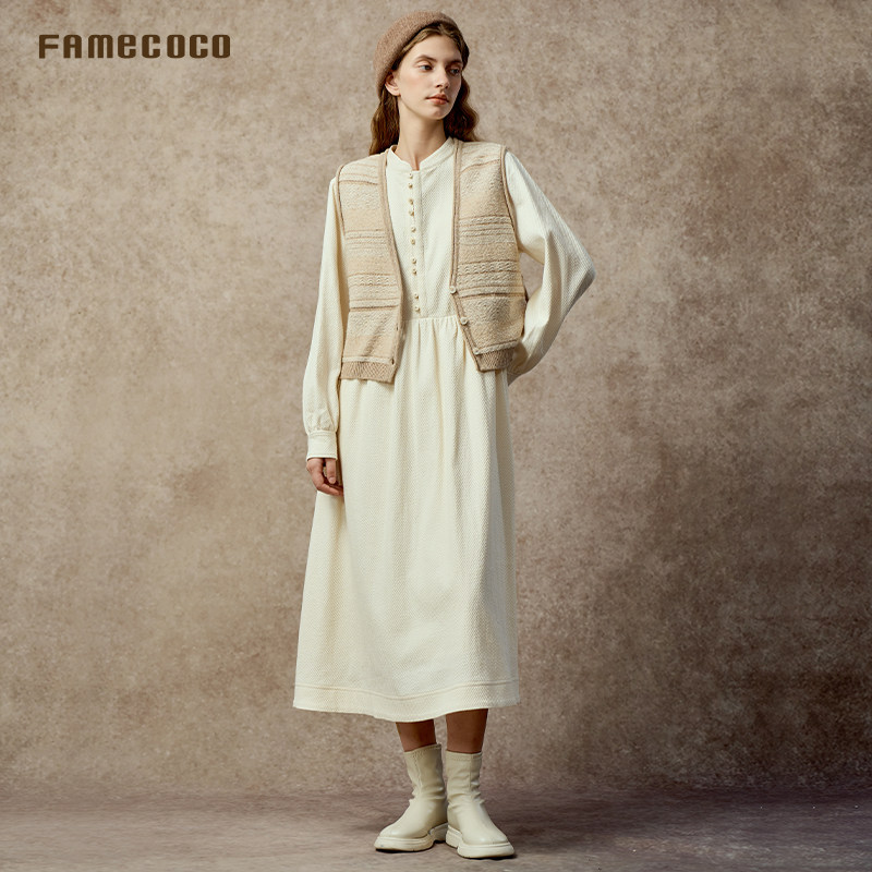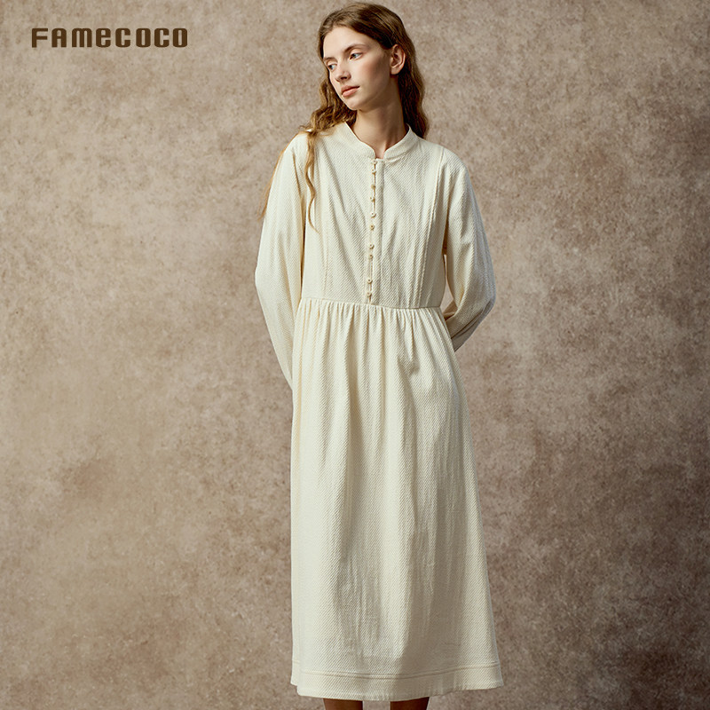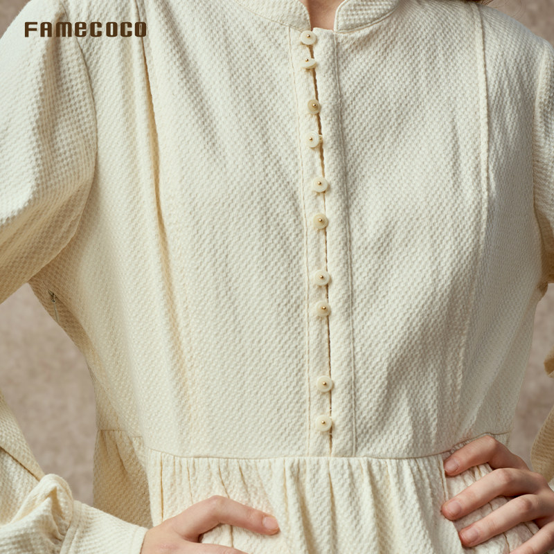 📚 Famecoco立领棉质加厚高腰长裙知识分子复古文艺连衣裙FAC8FA009