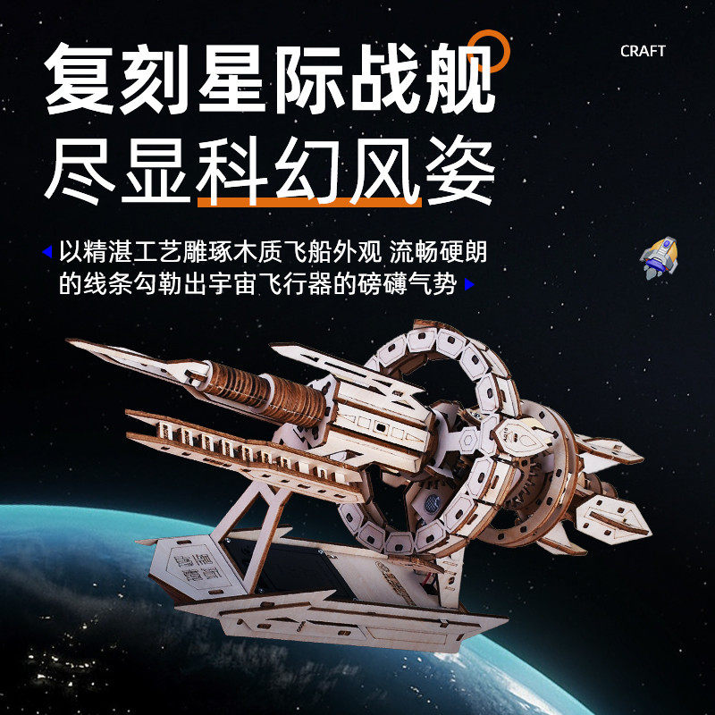 📚 木质diy拼装星际战舰电动机械传动飞船模型立体拼图榫卯积木玩具