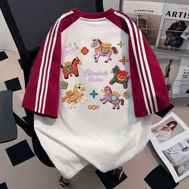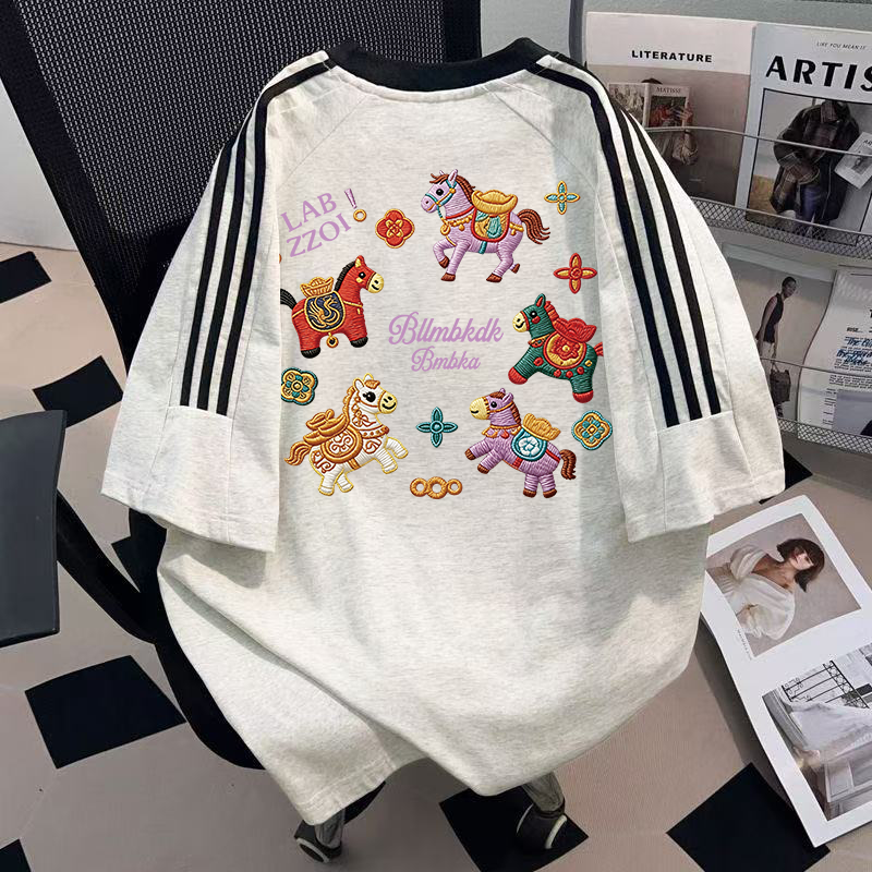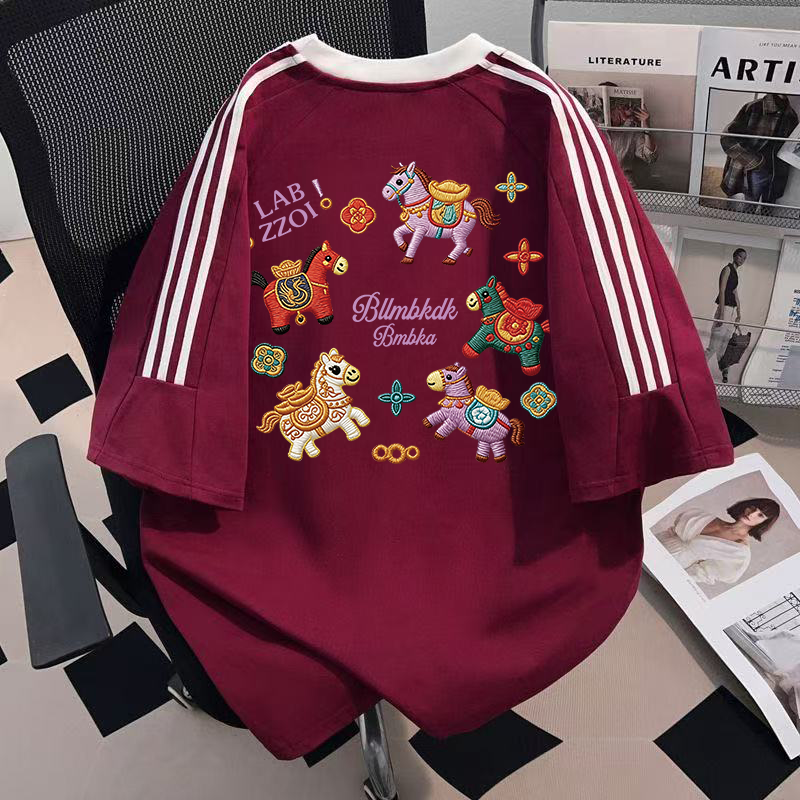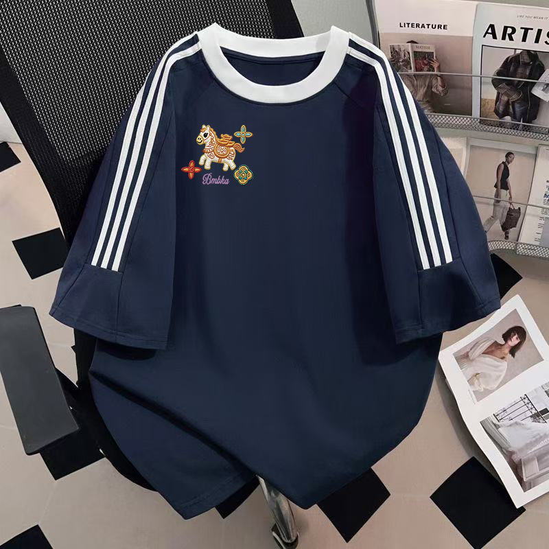 📚 纯棉三条杠藏青短袖t恤新款仿刺绣招财马夏季宽松设计感半袖上衣