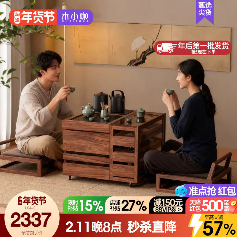 📚 木小咖叁森阳台茶桌小户型可移动实木茶边几泡茶带烧水茶水柜茶台