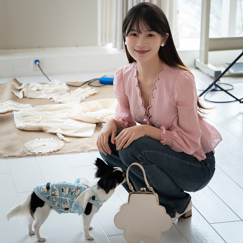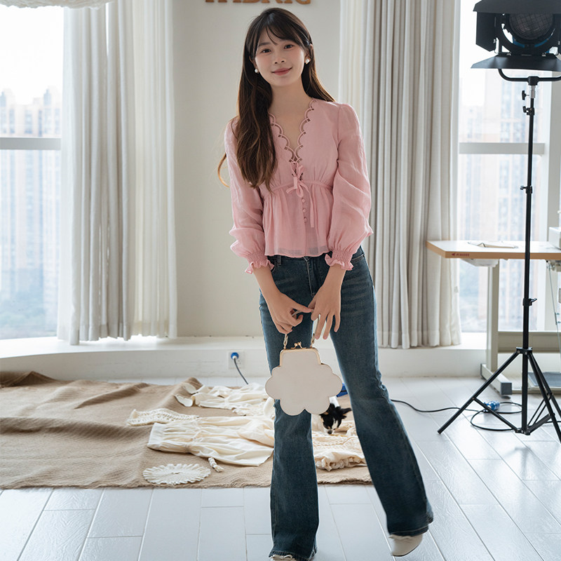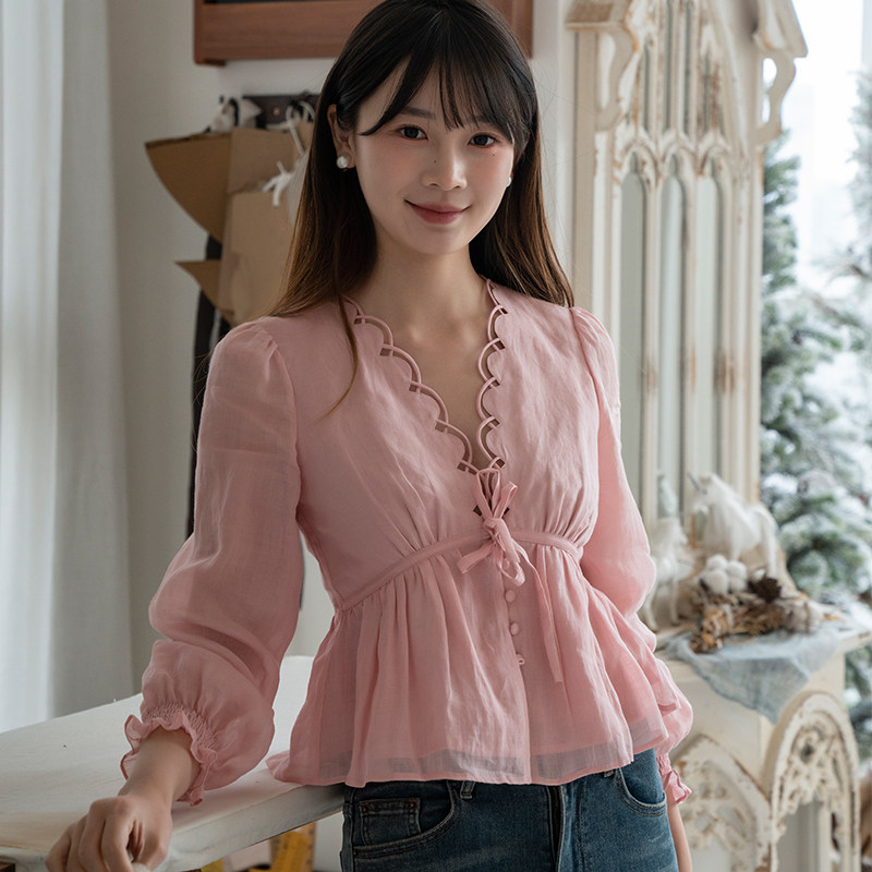 📚 原创定制ins风美式刺绣扇贝花边性感深V领上衣绑带衬衫苎麻小衫女