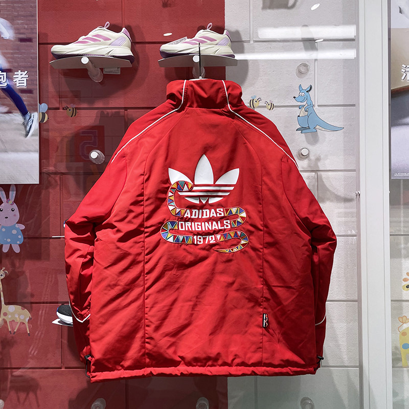 📚 阿迪达斯三叶草男装2025新年款蛇年双面穿红棕立领棉服外套KA0822