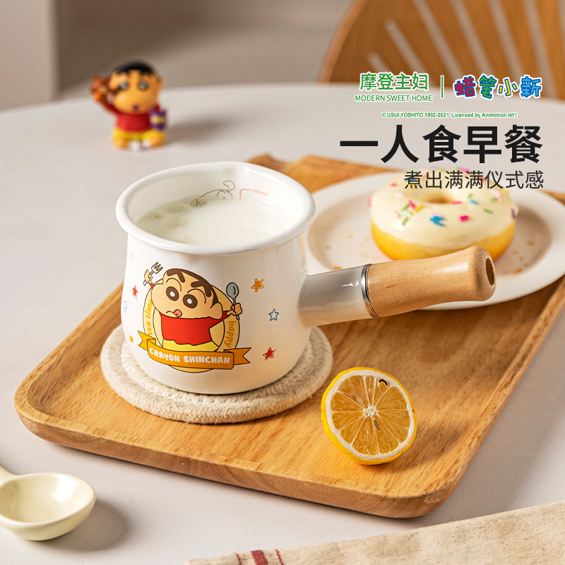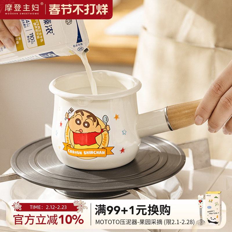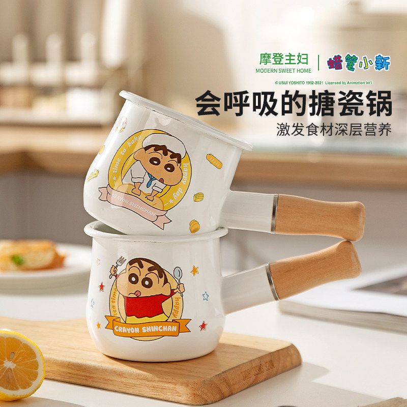 📚 【摩登主妇&蜡笔小新】搪瓷小奶锅迷你辅食专用锅热牛奶煮奶茶锅