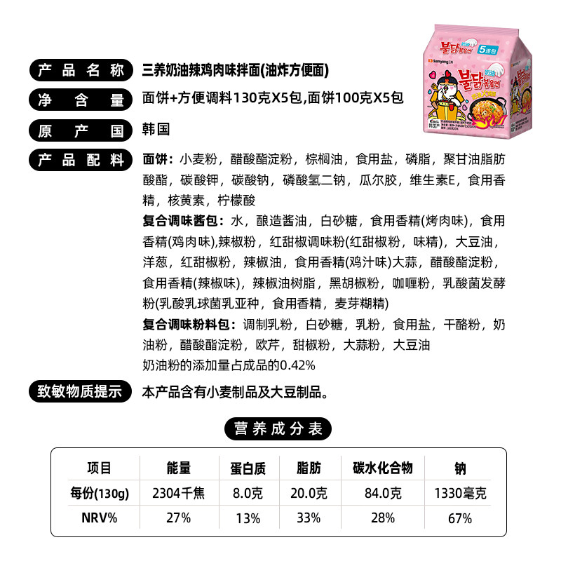 📚 【下拉享优惠】韩国三养奶油味火鸡面130g*5袋方便面泡面速食