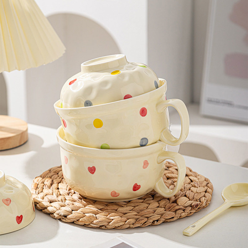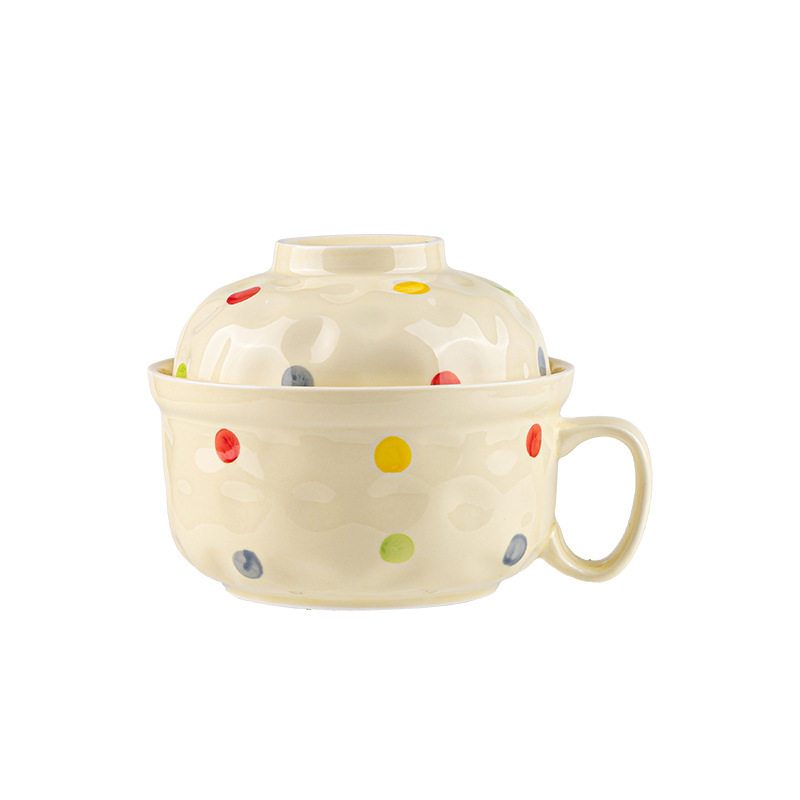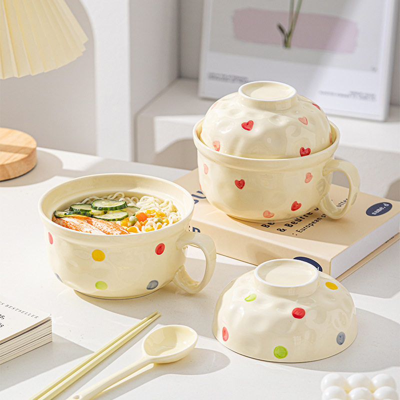 📚 奶油风陶瓷泡面碗带盖在家用宿舍用方便面釉下彩学生打饭碗筷套装
