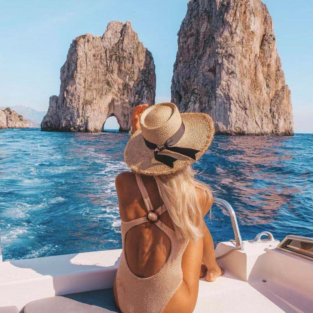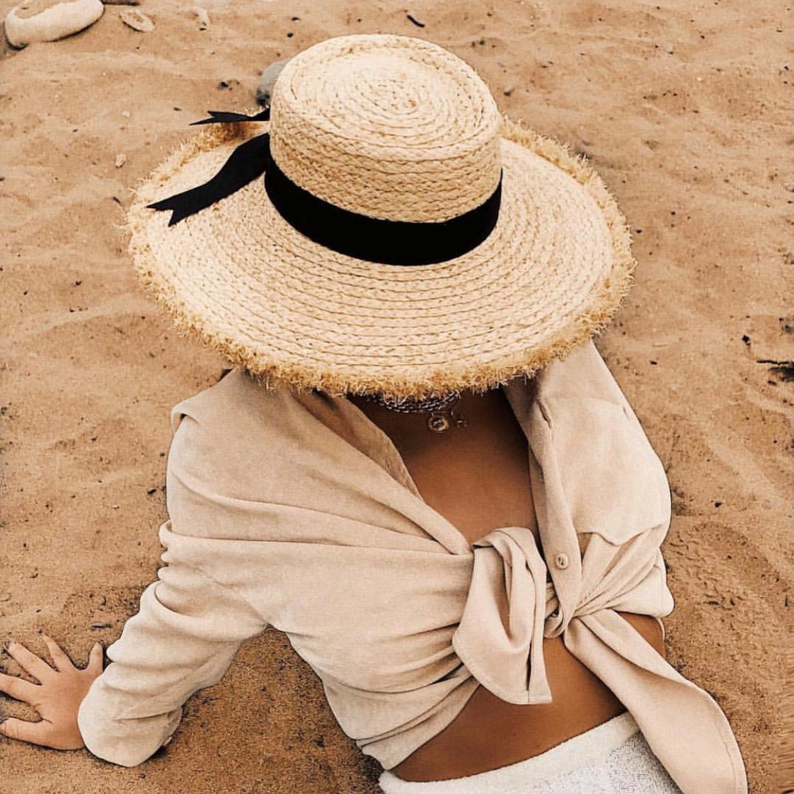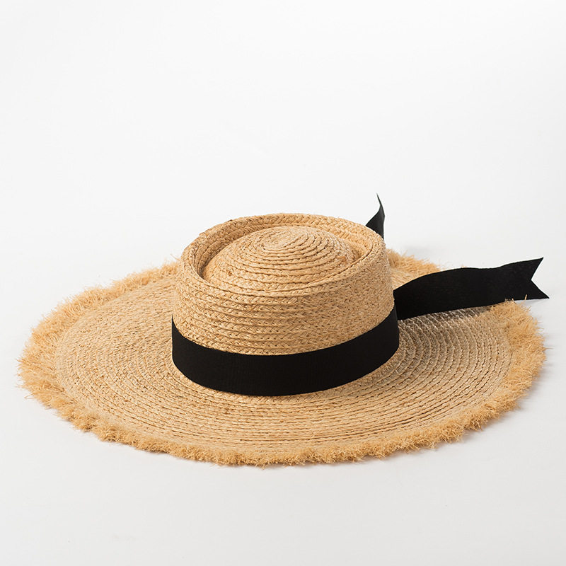 📚 欧美风格春夏新款毛边拉菲草帽圆环顶大檐沙滩帽飘带度假遮阳帽子