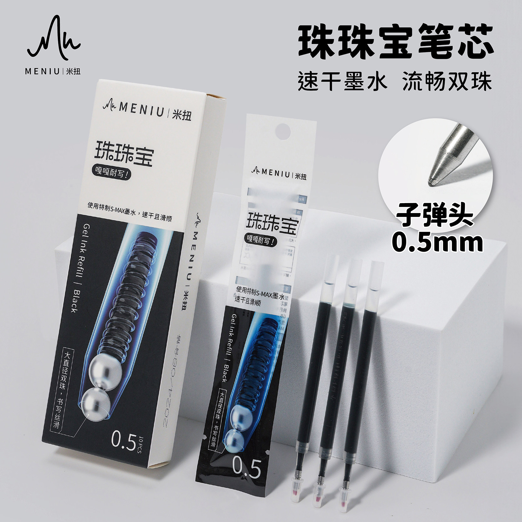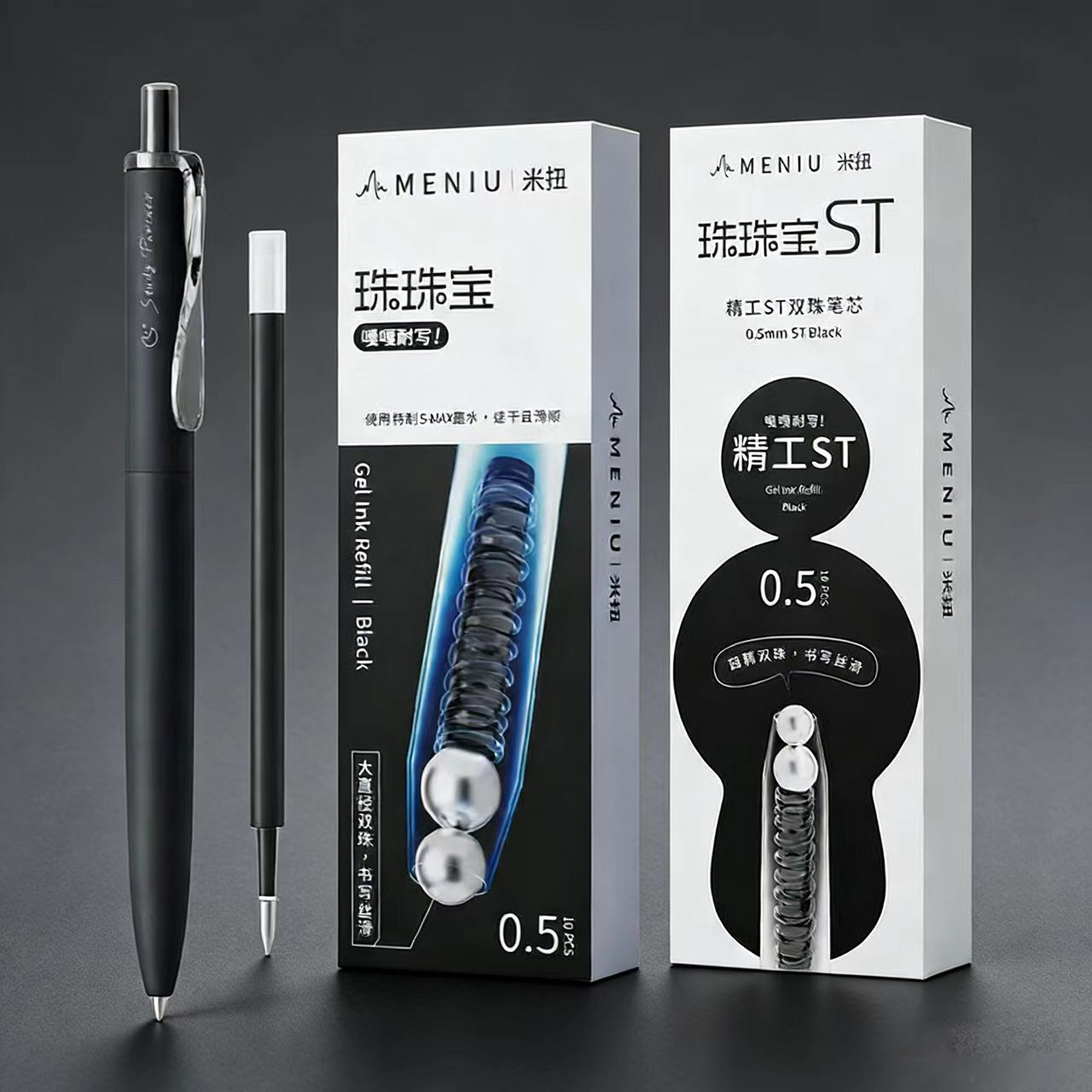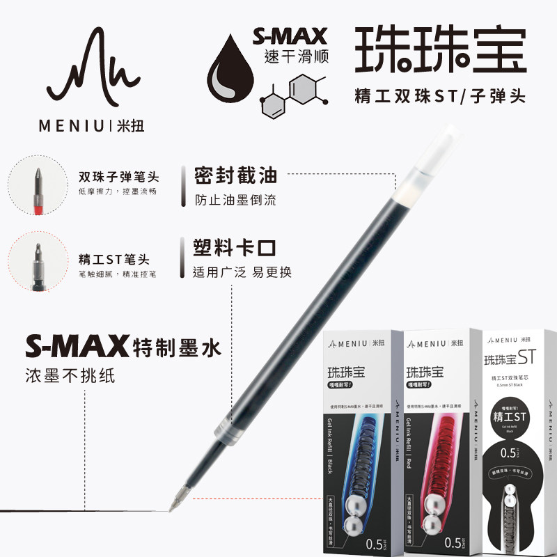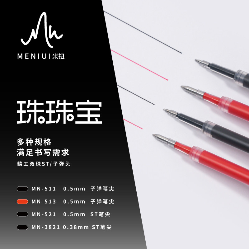📚 MENIU米扭中性笔替芯黑色大容量按动式双珠子弹头0.5黑红笔通用替芯ST学生考试刷题笔学习搭子速干平替水笔芯