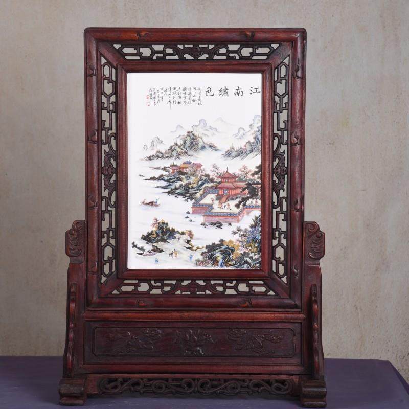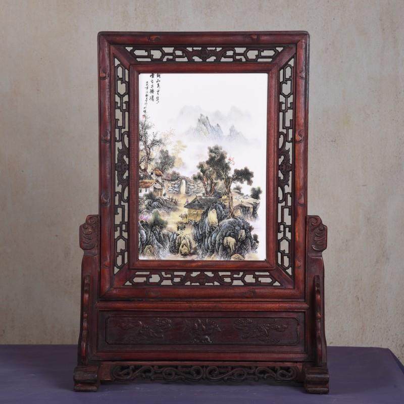 📚 仿古实木框陶瓷板画插屏坐屏瓷板画 中式家居中堂古典装饰品摆件