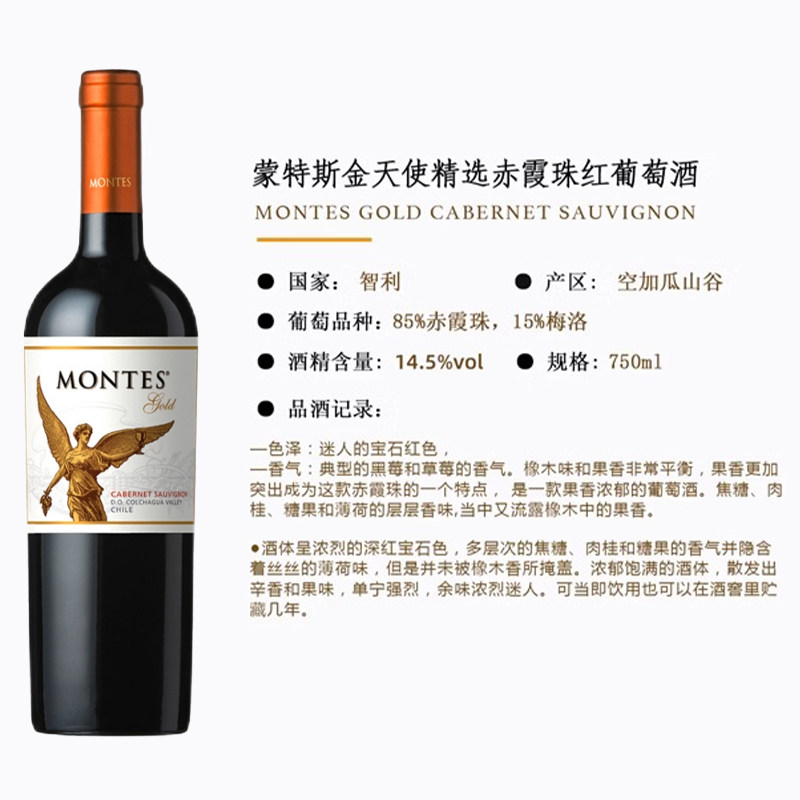 📚 智利montes蒙特斯天使金天使精选赤霞珠干红葡萄酒750ml原瓶进口