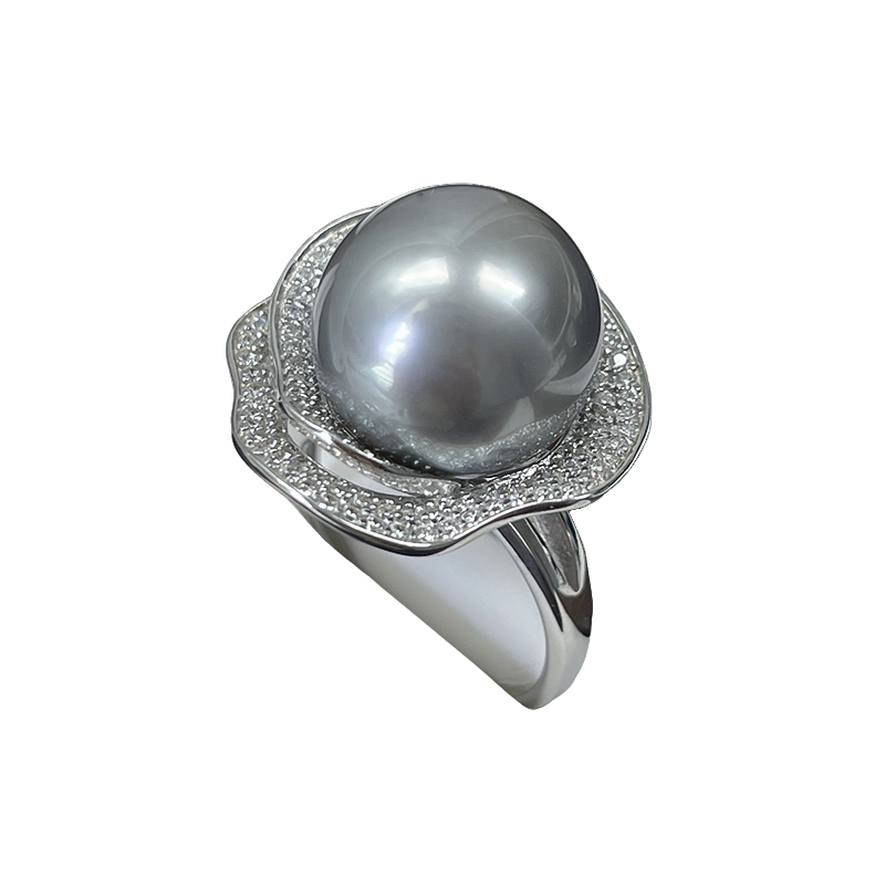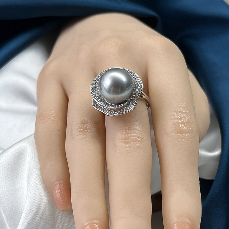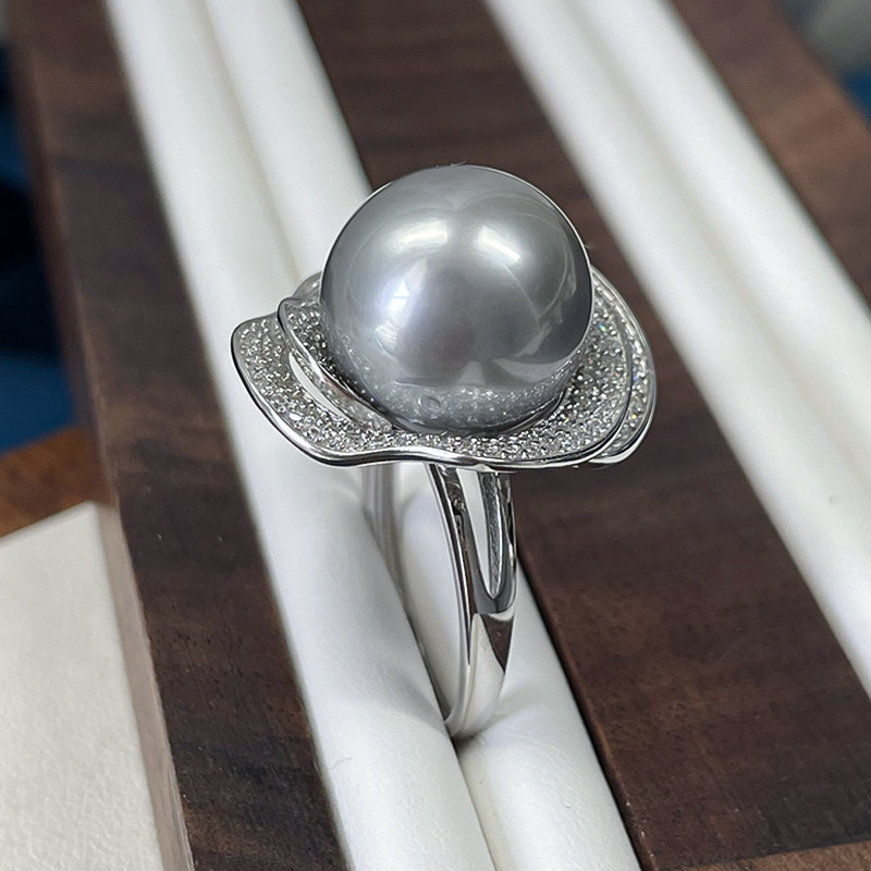 📚 11- 15mm铂金灰山茶花款大溪地黑珍珠戒指海水925银大点位送爱人