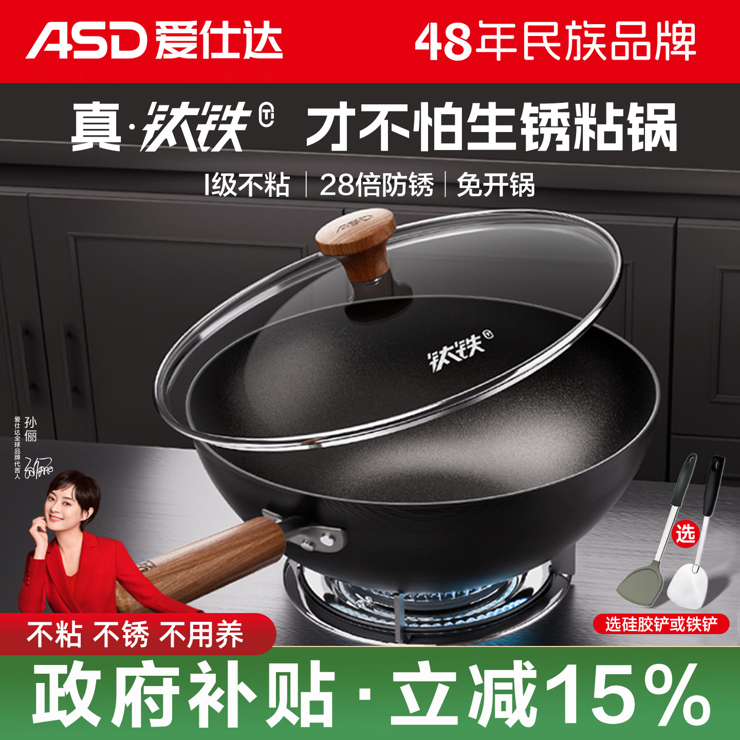 📚 爱仕达有钛铁锅炒菜锅家用不粘炒锅0涂层免开锅电磁炉燃气专用锅