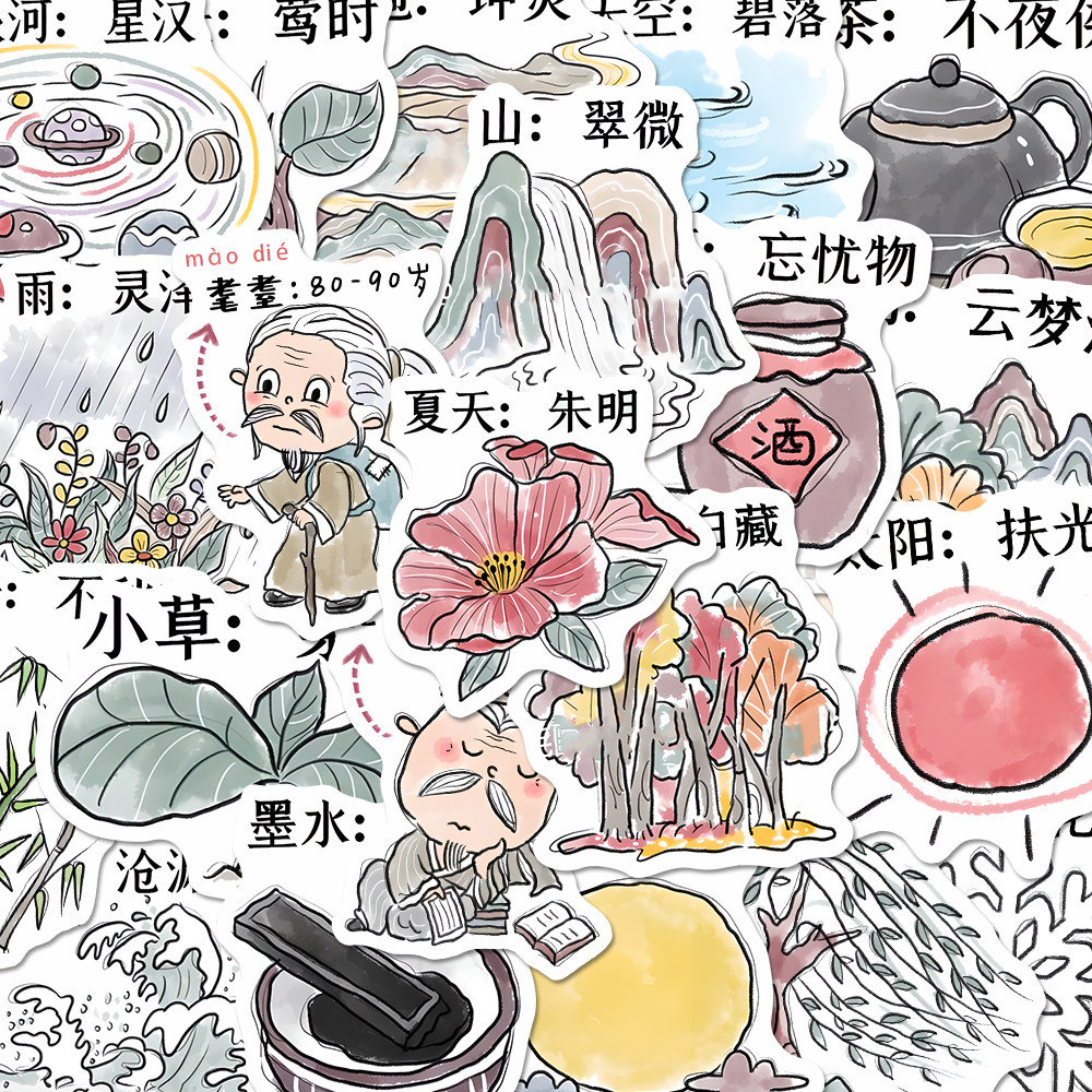 📚 122张古人对万物的雅称漫画贴纸中国传统称呼儿童启蒙笔记本贴画