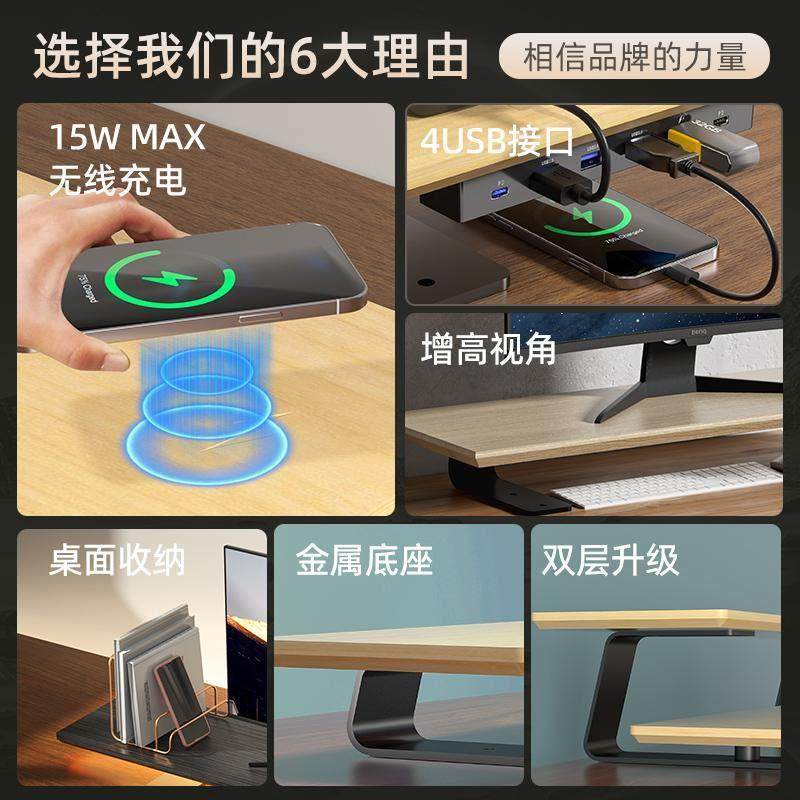 📚 星利星球电脑萤幕增高架木质多功能带USB3.0快充无线 线充扩展屏