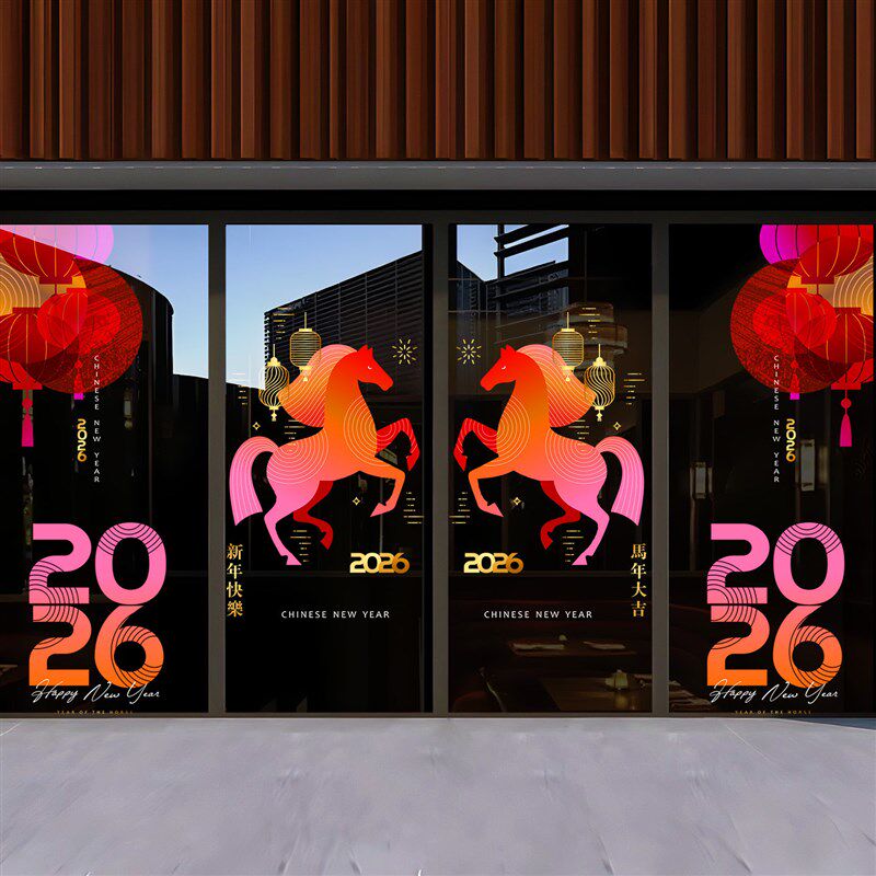 📚 2026马年新年装饰玻璃贴纸商场公司橱窗春节过年氛围布置静电窗花