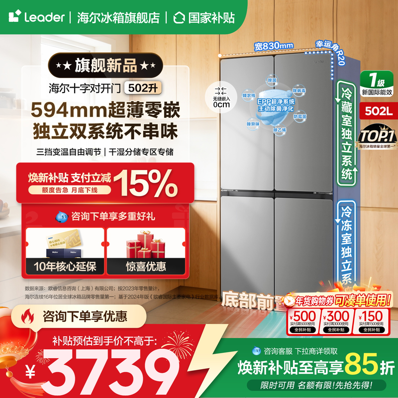 💥双循环系统下的品质之选!海尔出品统帅冰箱502L十字四开门一级变频,券后价7999元💥