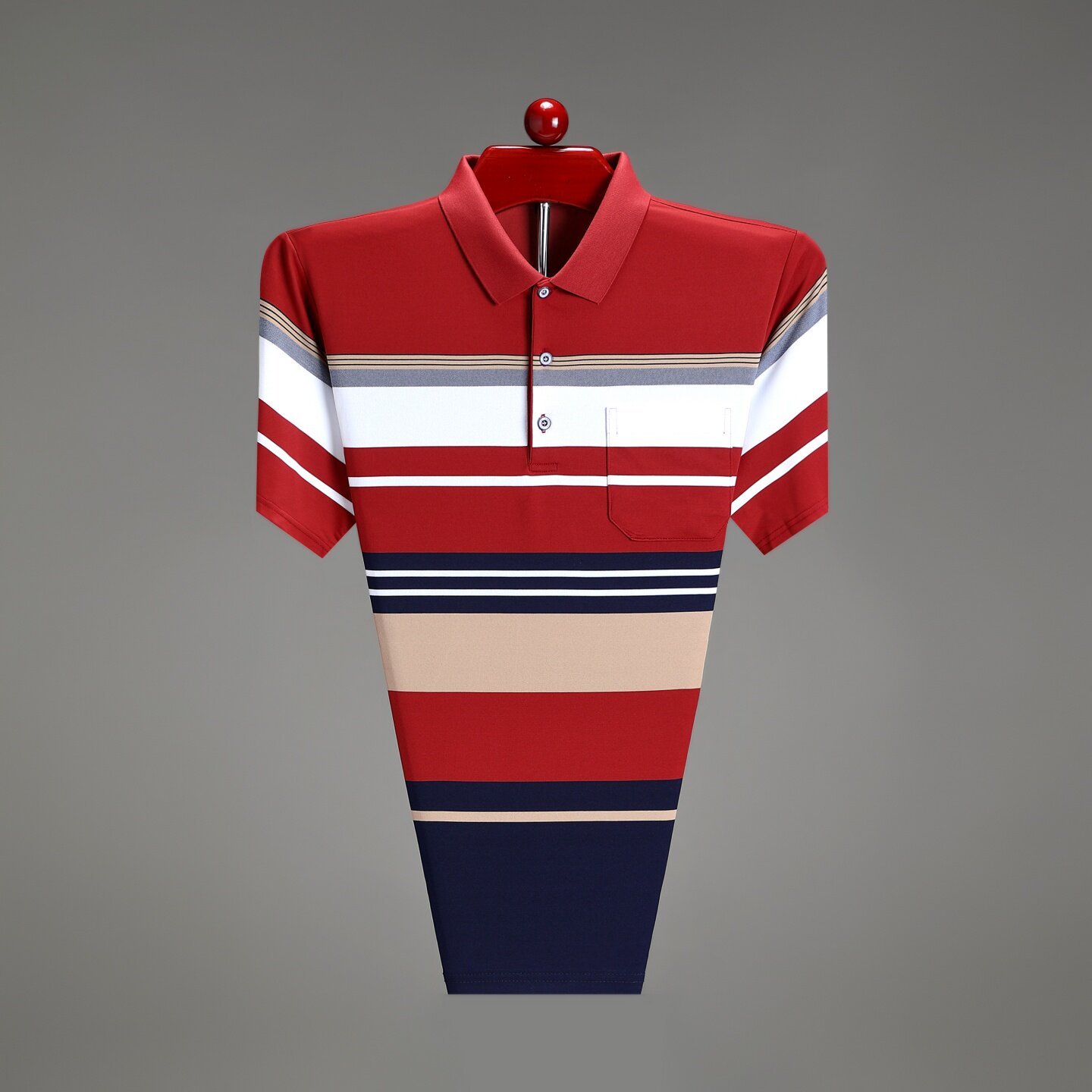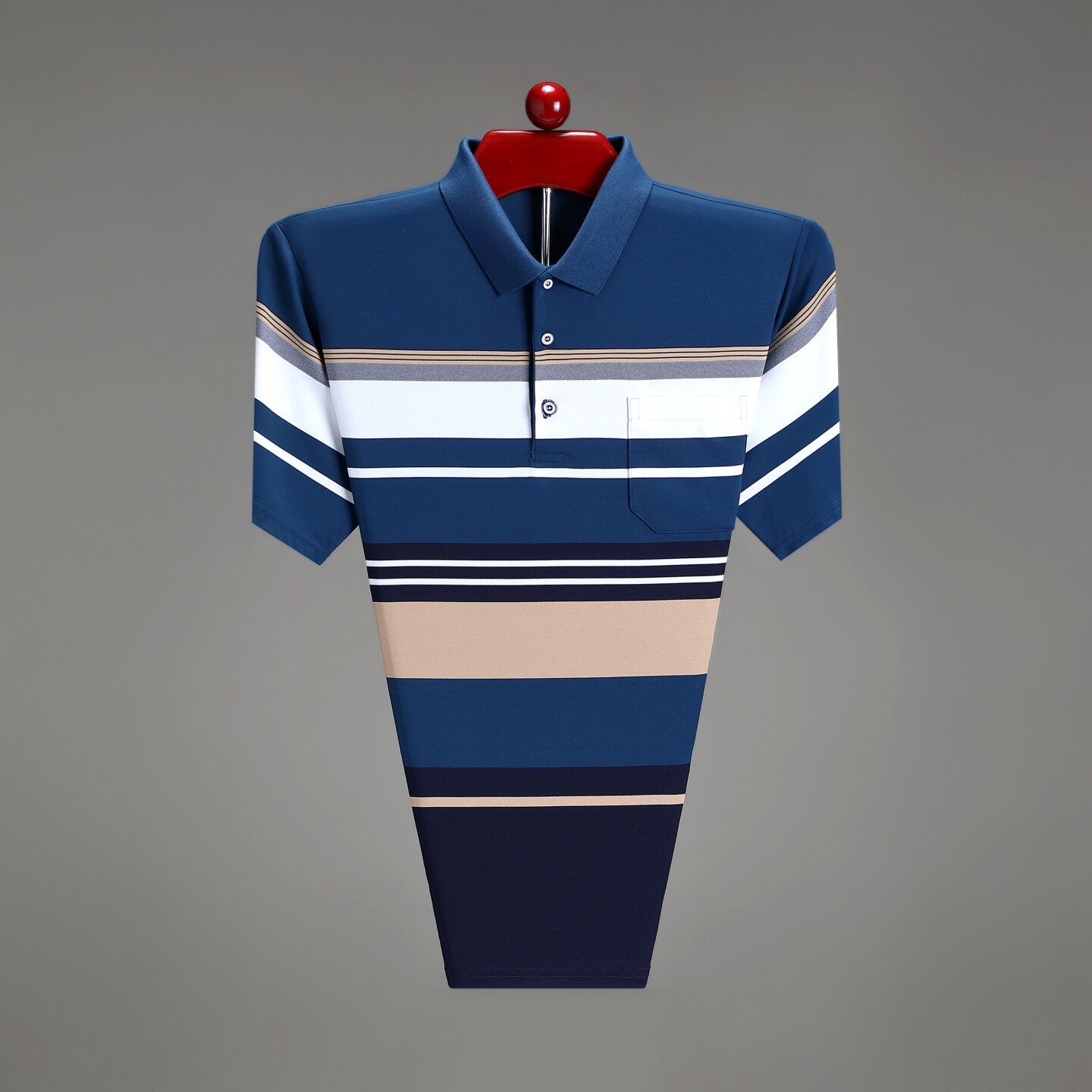 📚 男士夏季POLO衫短袖t恤条纹中年爸爸装冰丝有带口袋翻有带领上衣
