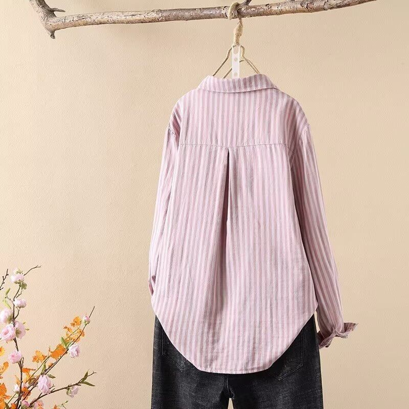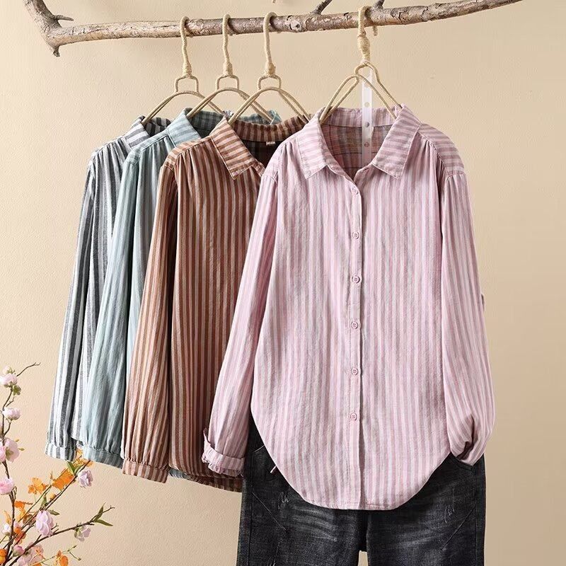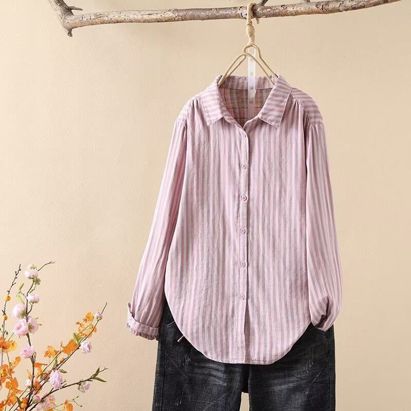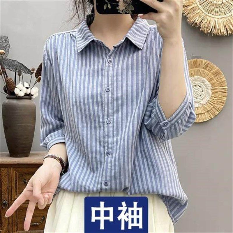 📚 中袖衬衫女 双层棉纱竖条纹宽条显瘦色织纯棉宽松气质尖领五分袖