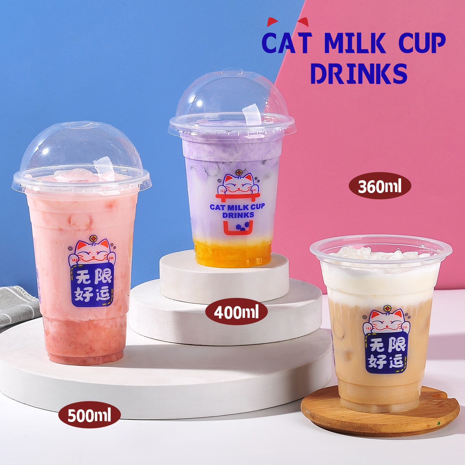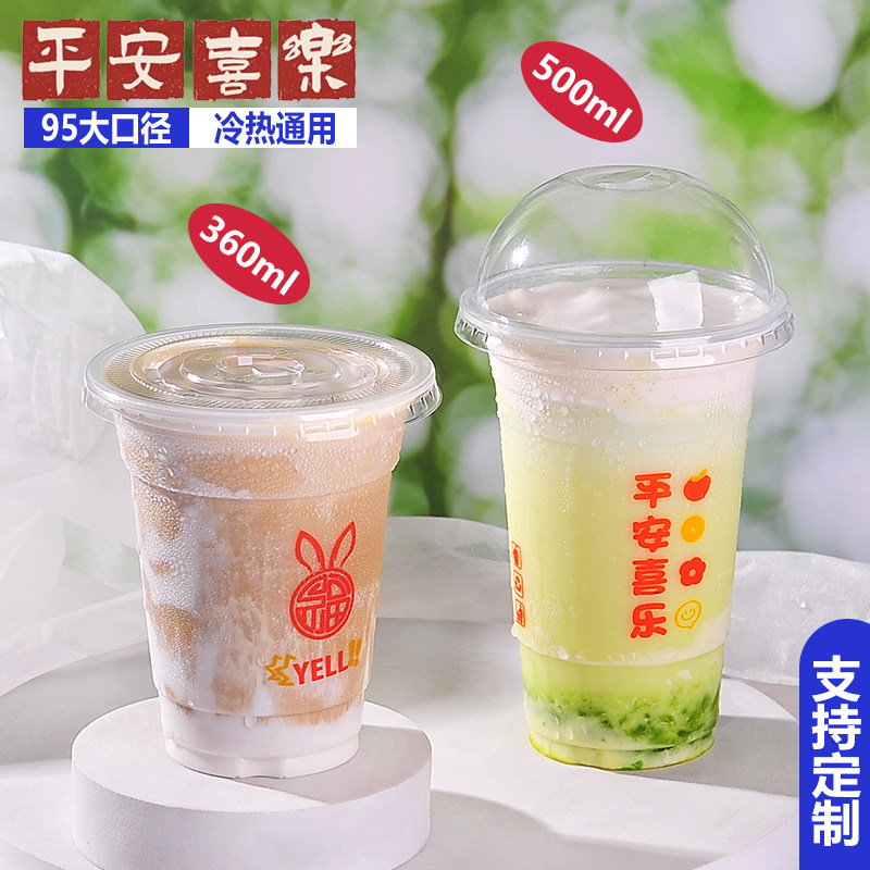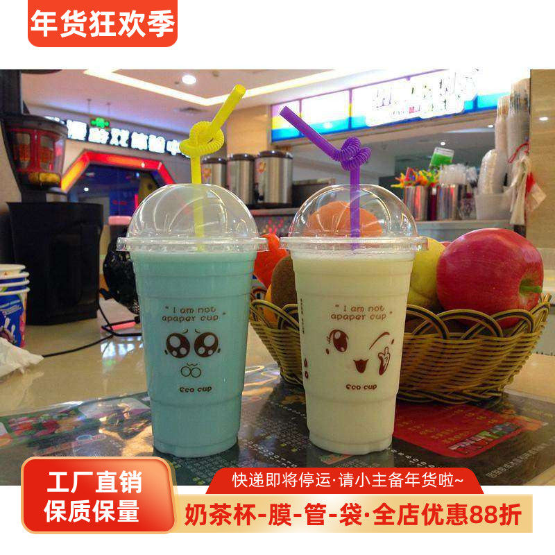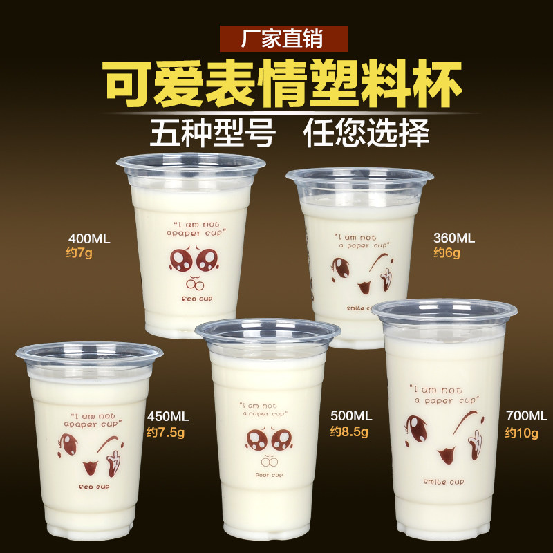 📚 500ml加厚可爱表情一次性奶茶杯子塑料冷热饮打包带盖包邮可定制