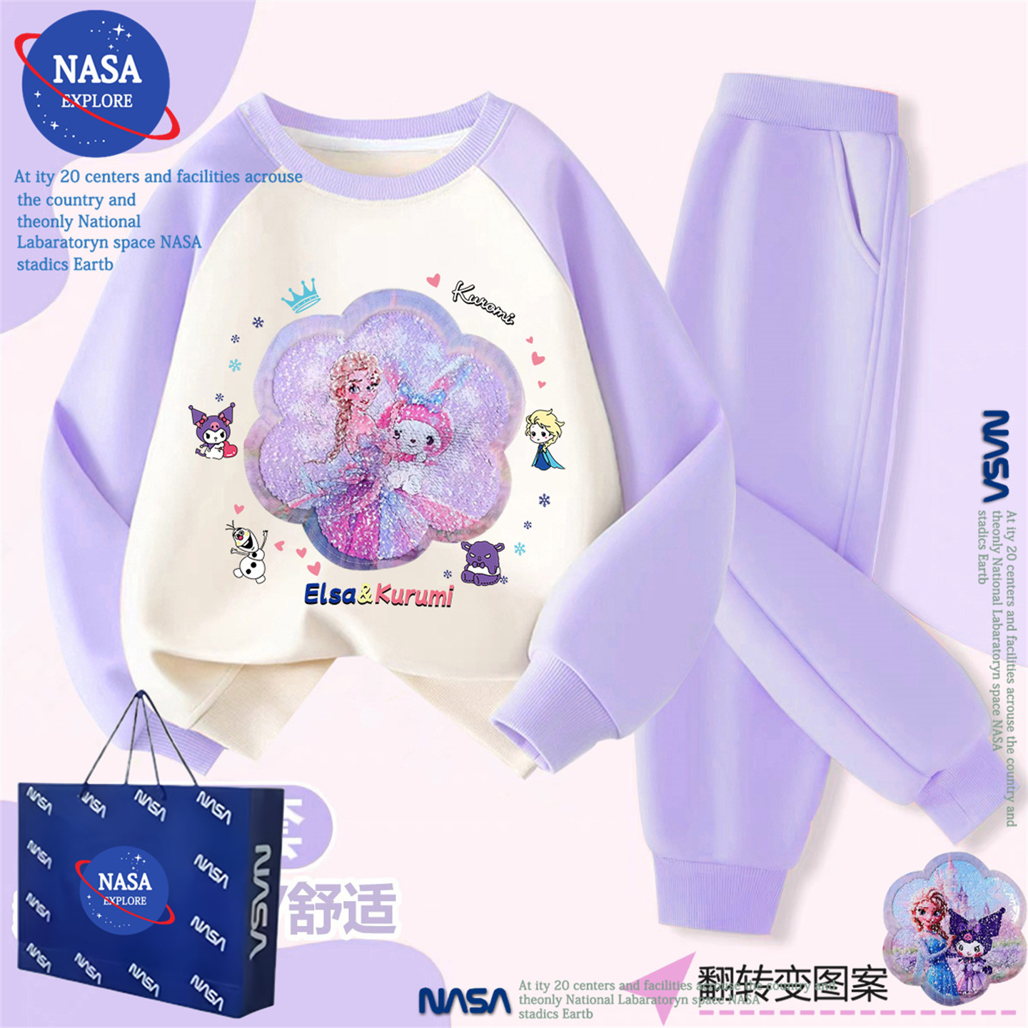 📚 NASA女童亮片艾莎公主套装秋冬季女孩加绒加厚卫衣长裤子两件套潮