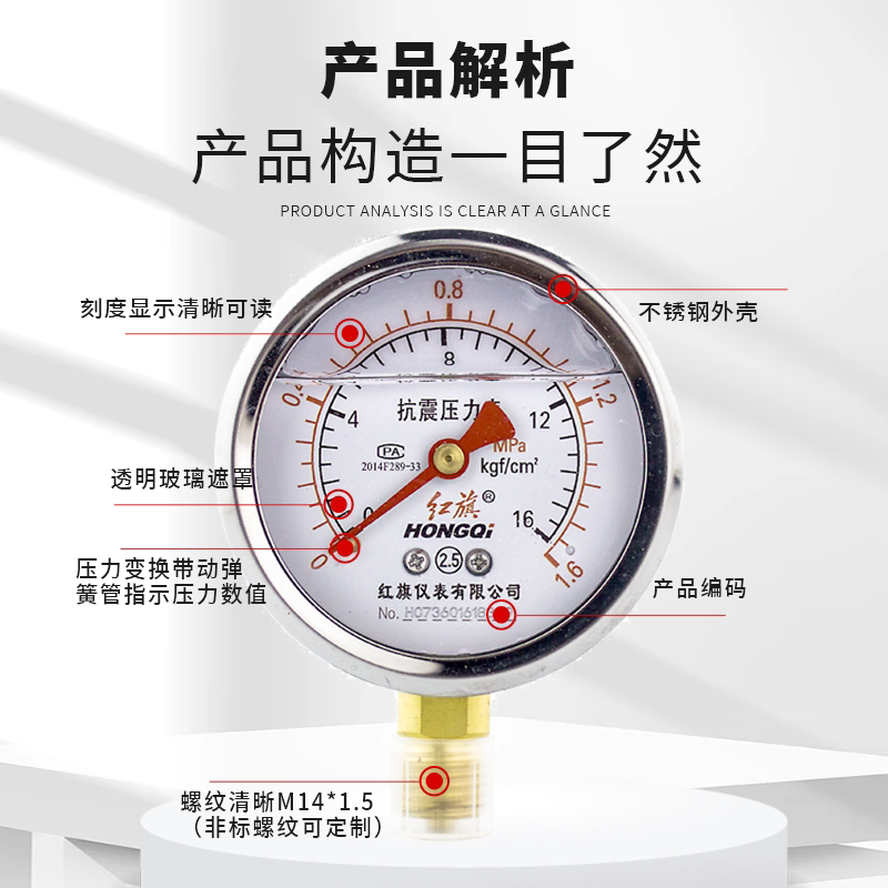 📚 红旗仪表 耐震防震抗震压力表YTN-60 0-1MPa充油压力表 真空表