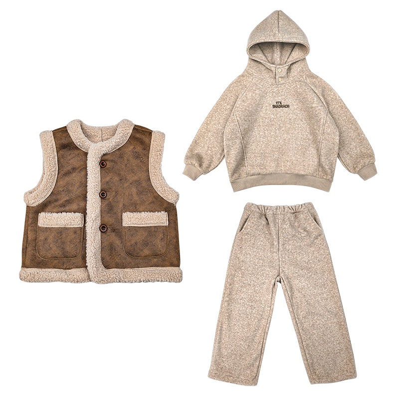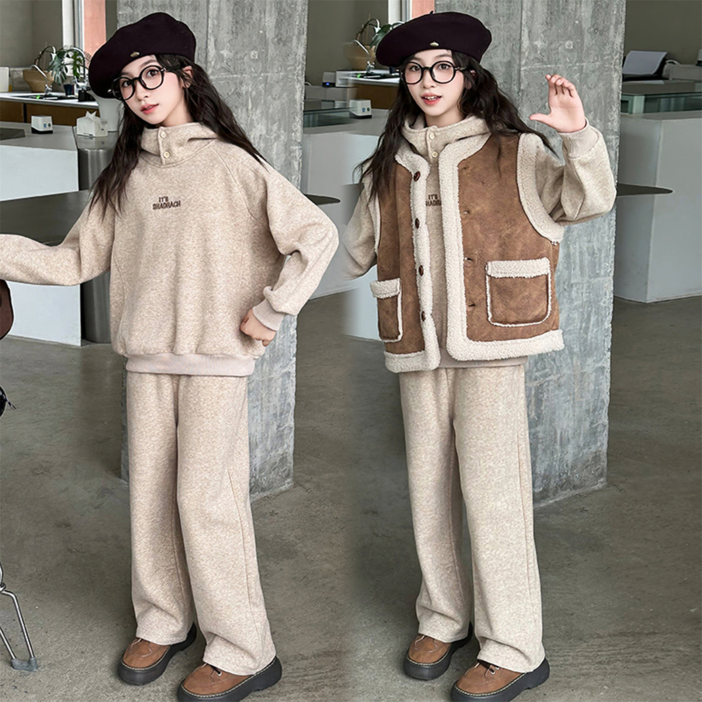 📚 冬季加绒加厚套装女童卫衣中大童连帽刺绣韩版洋气鹿皮绒马甲三件