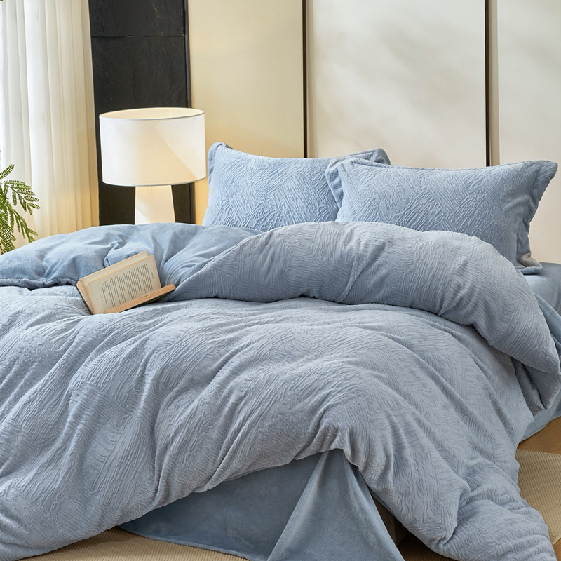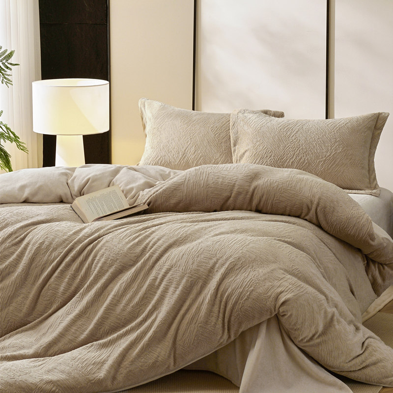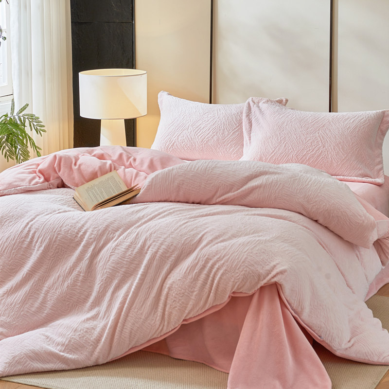这款四件套的材质真的是让人惊艳!采用法兰绒、牛奶绒、加厚绒等多种面料,触感柔软细腻,仿佛在肌肤上轻轻抚过。特别是那珊瑚绒的元素,给人一种温暖又时尚的感觉。