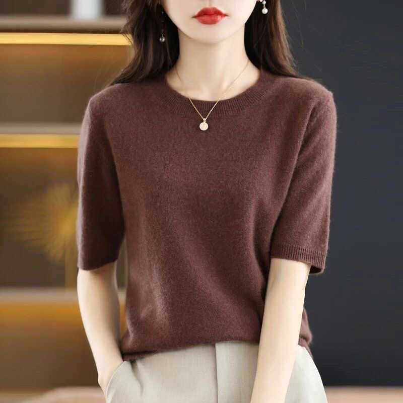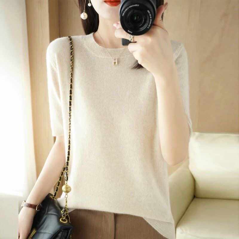 📚 2024春秋圆领套头毛衣女中袖打底衫宽松五分袖针织短袖女内搭上衣