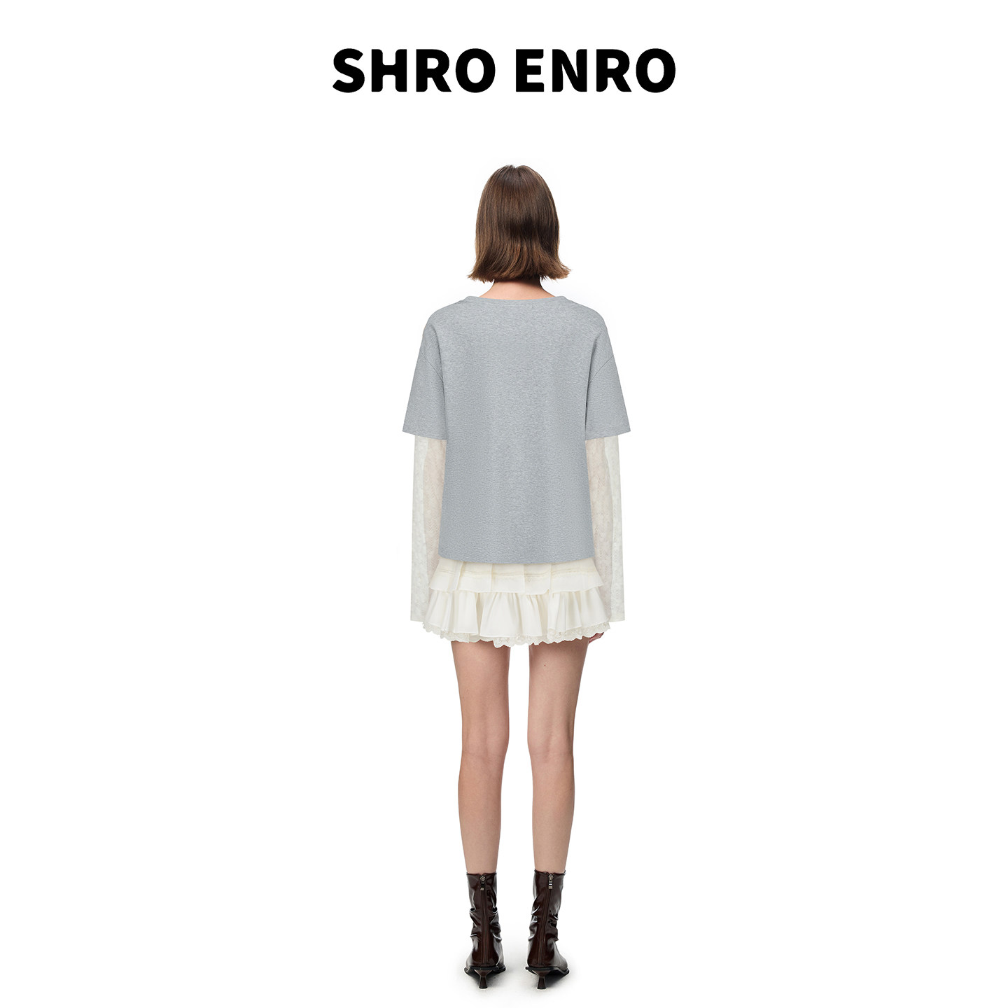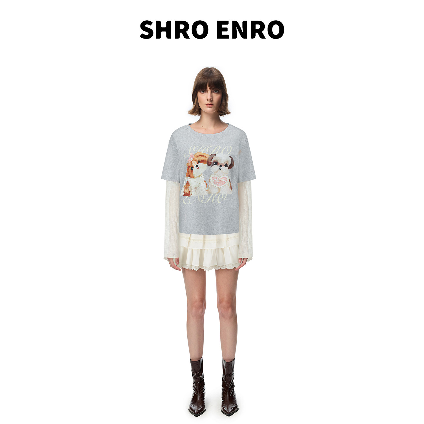 📚 SHRO ENRO 2026年春季新款百搭正肩小狗印花拼接蕾丝长袖T恤上衣