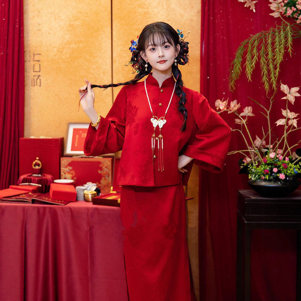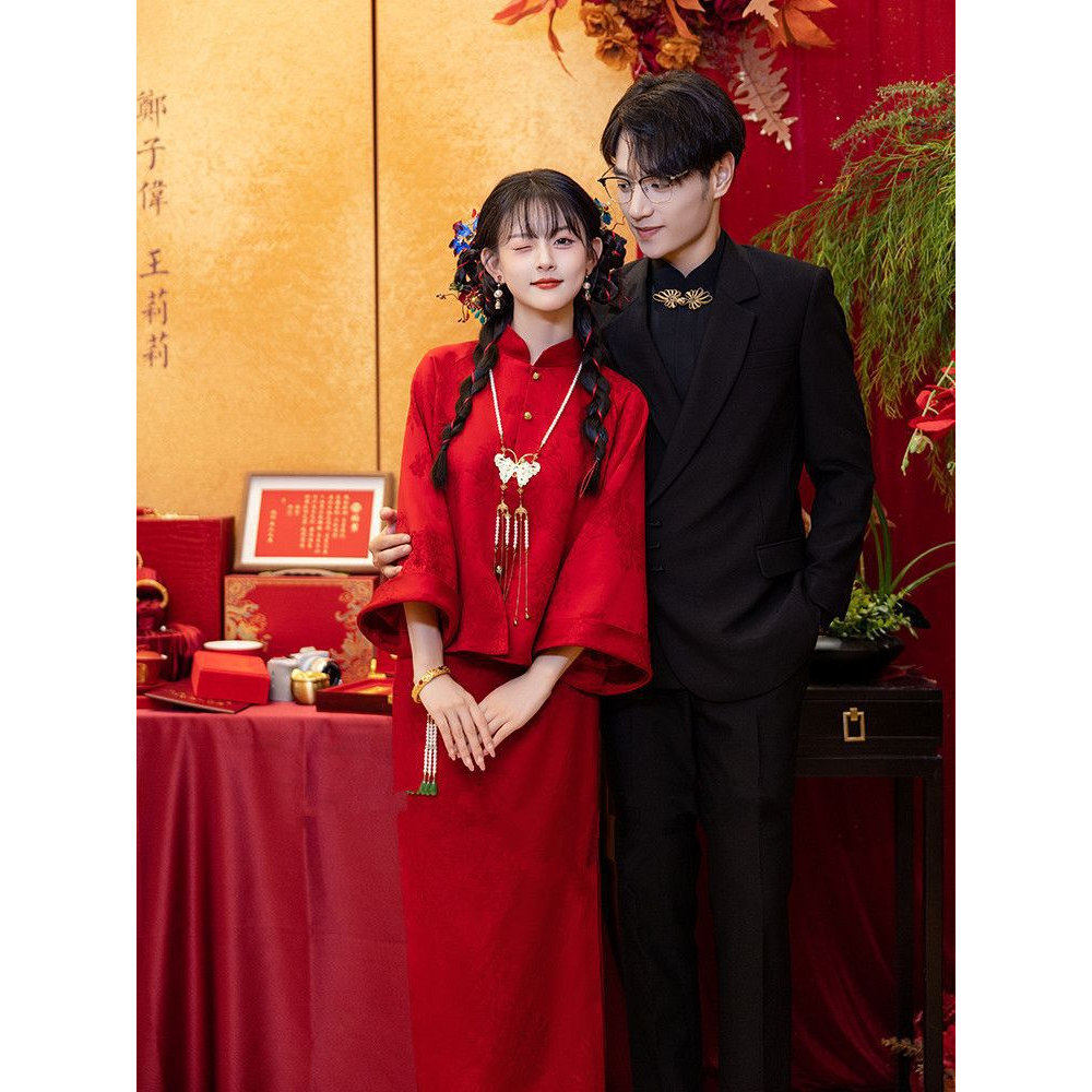 📚 新中式旗袍晨袍新娘2025款秋冬季敬酒服红色订婚礼服裙两件套回门