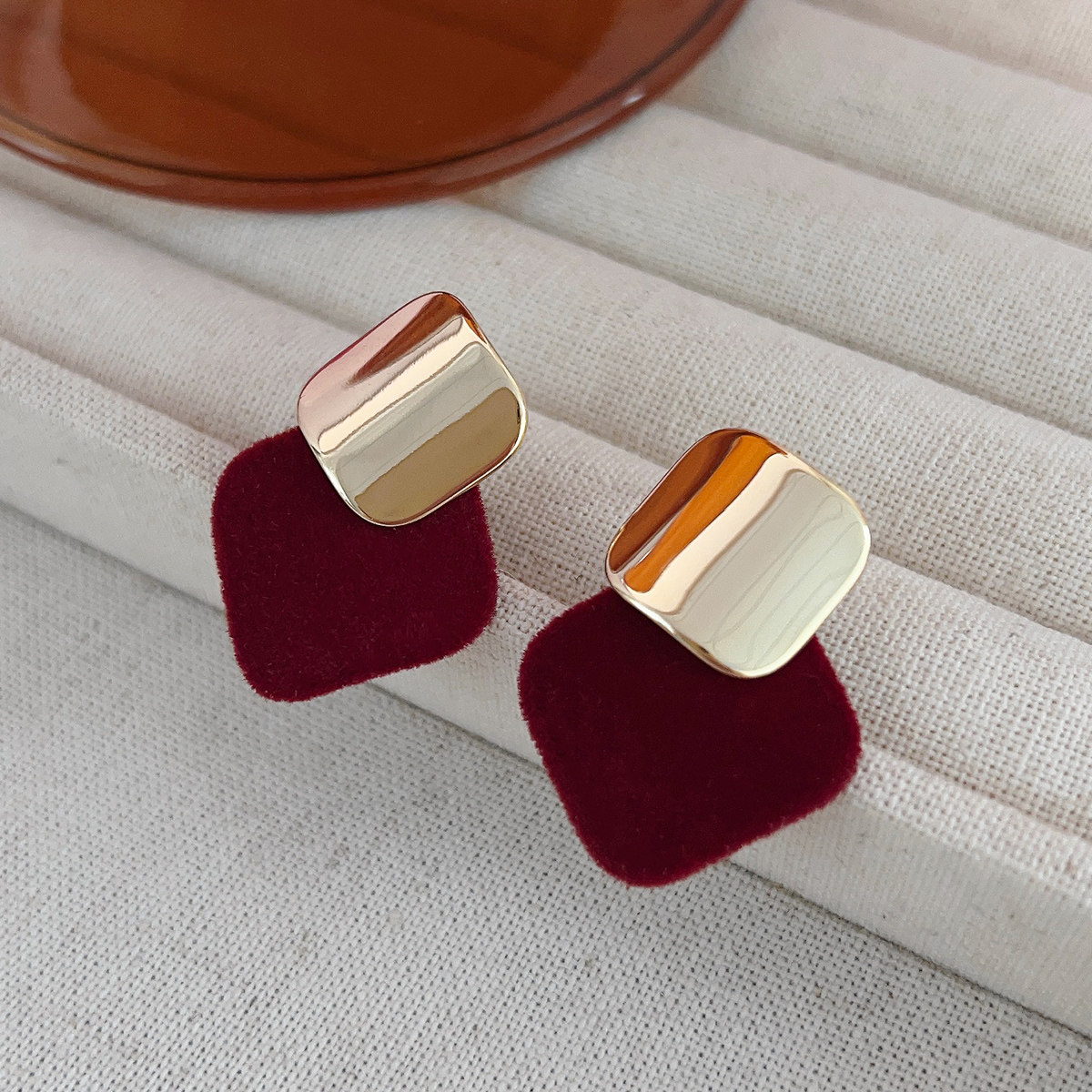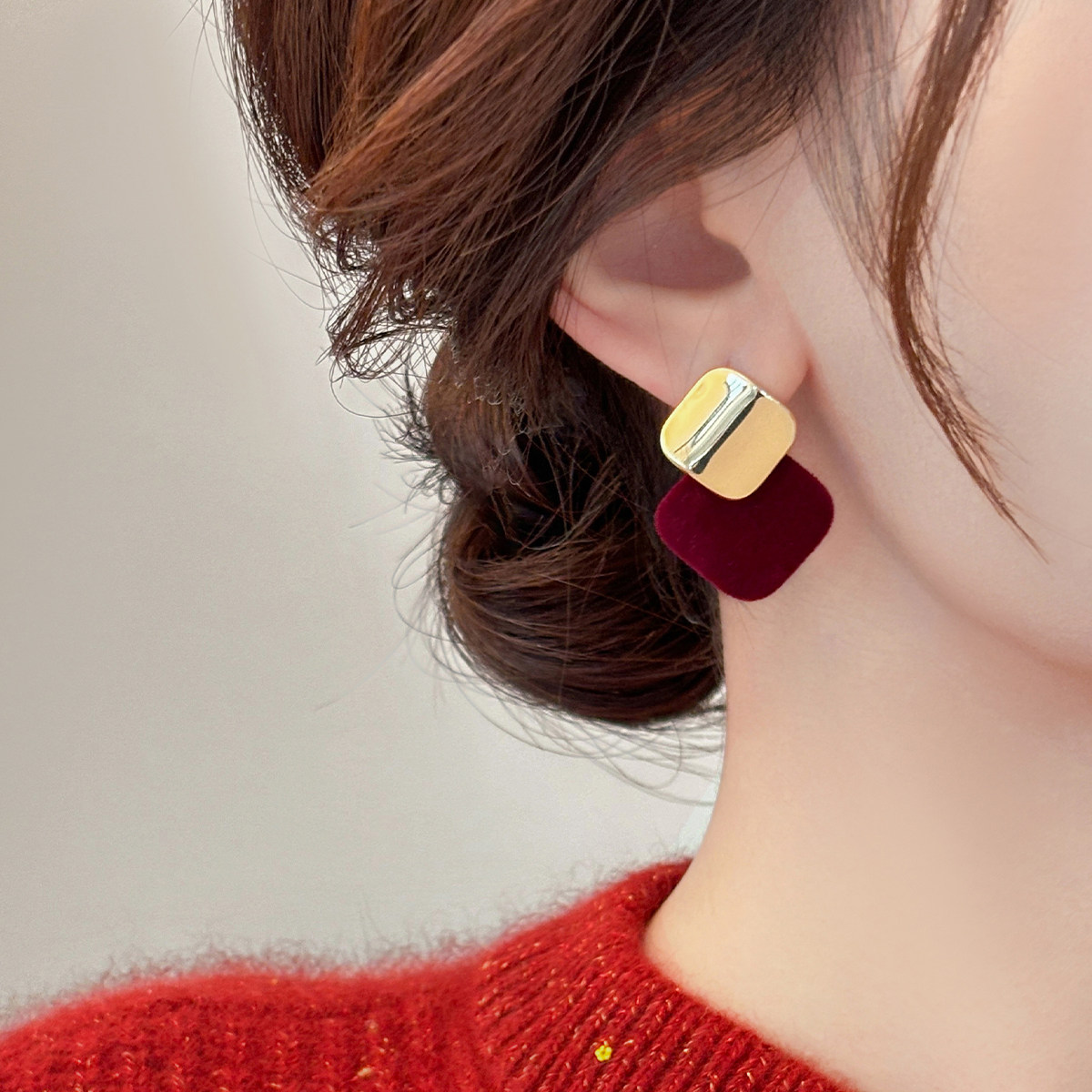 📚 复古酒红色丝绒几何耳钉女2025新款秋冬轻奢精致高级感耳环耳饰