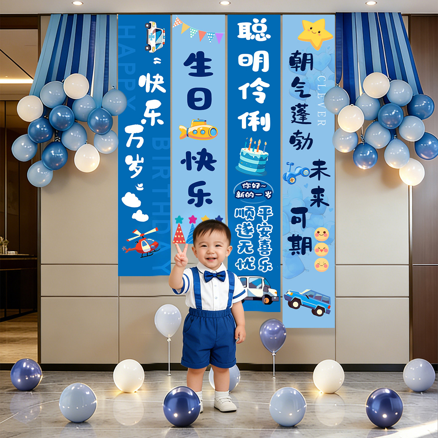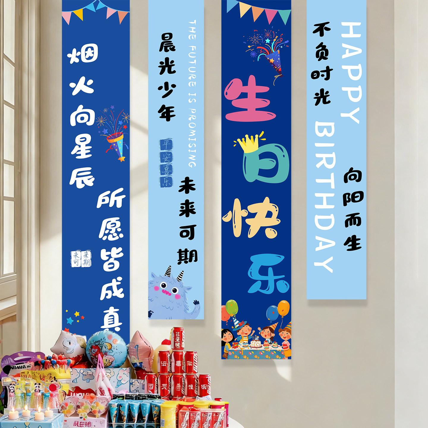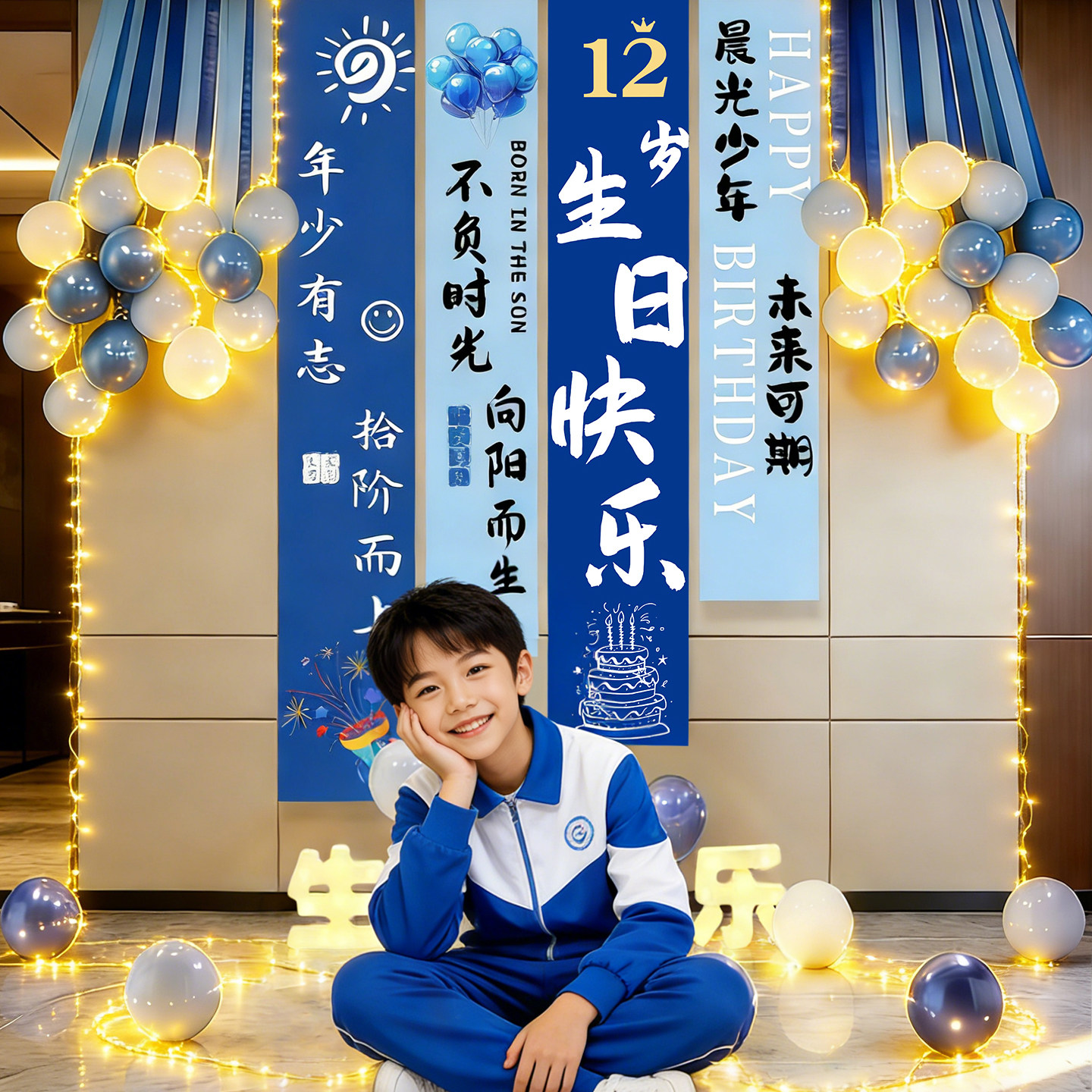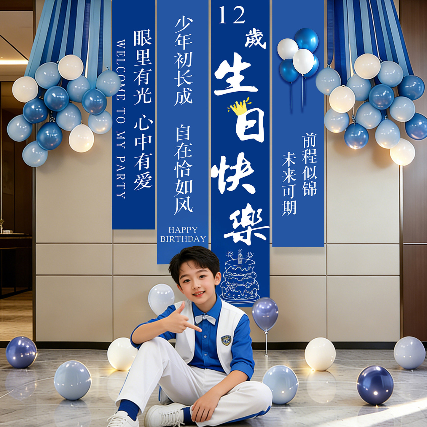 📚 12岁男孩生日场景布置装饰蓝色高级感背景布儿童派对快乐条幅挂布