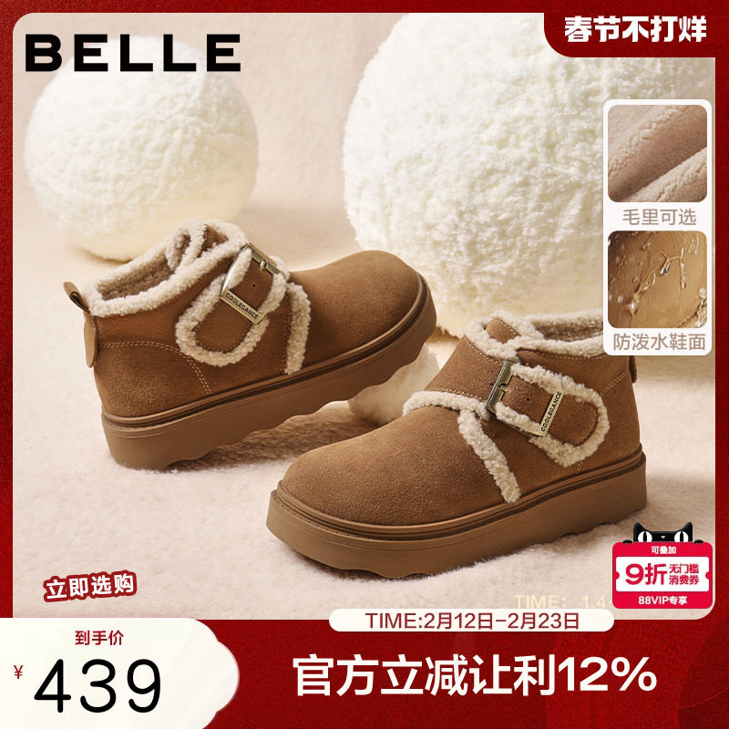 📚 百丽女靴子毛边雪地靴轻便新款棉鞋毛毛勃肯鞋厚底保暖短靴E5M1DD