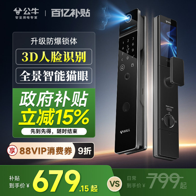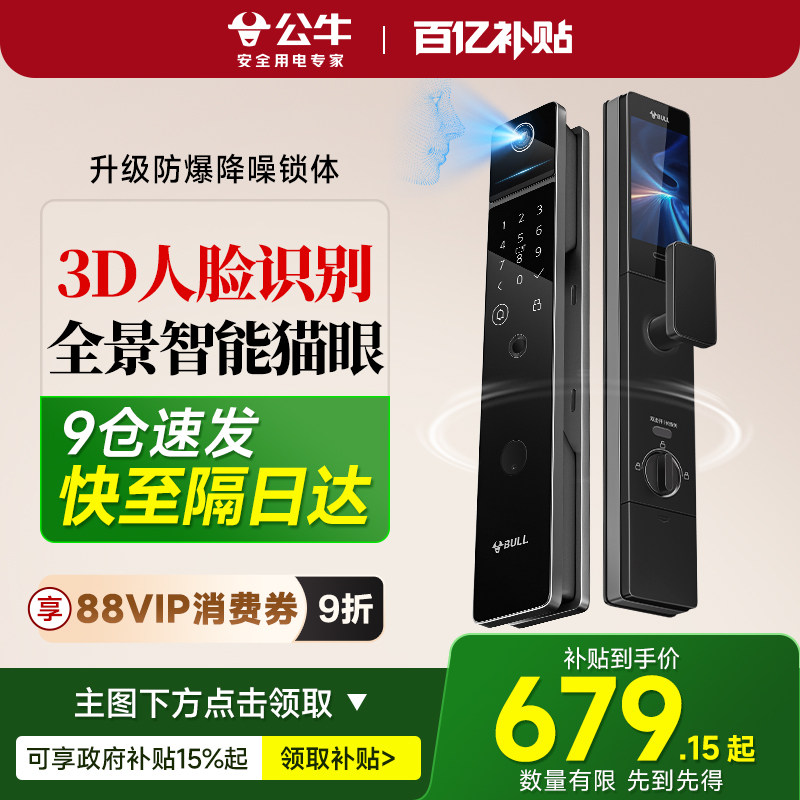 08¥ CZ321 g49sUGEY9nB¥ https://m.tb.cn/h.iX5BYVU 公牛智能门锁全自动指纹锁家用防盗门人脸识别智能锁密码锁电子锁 --------------------- 【原售价】3,999元 【现售价】1,799元。
