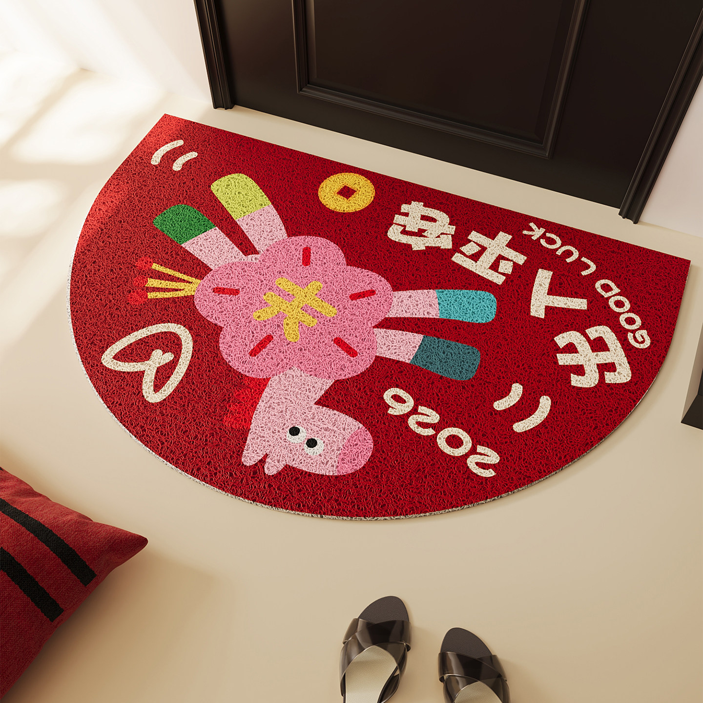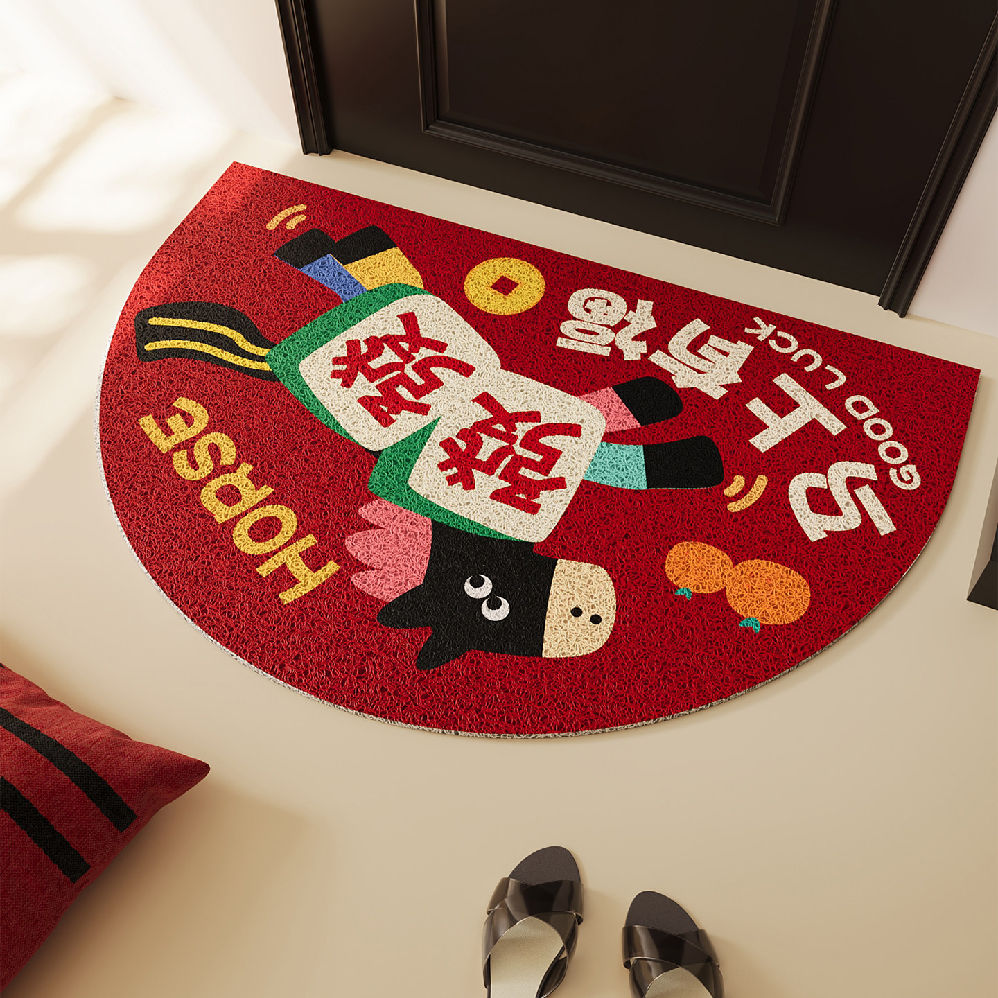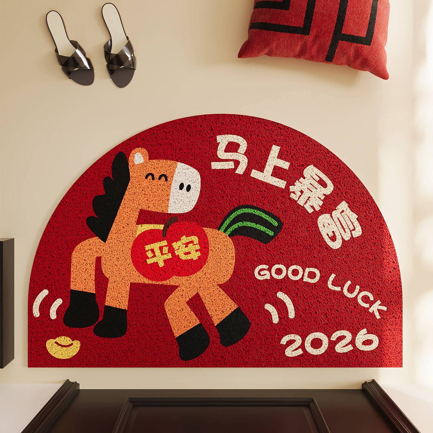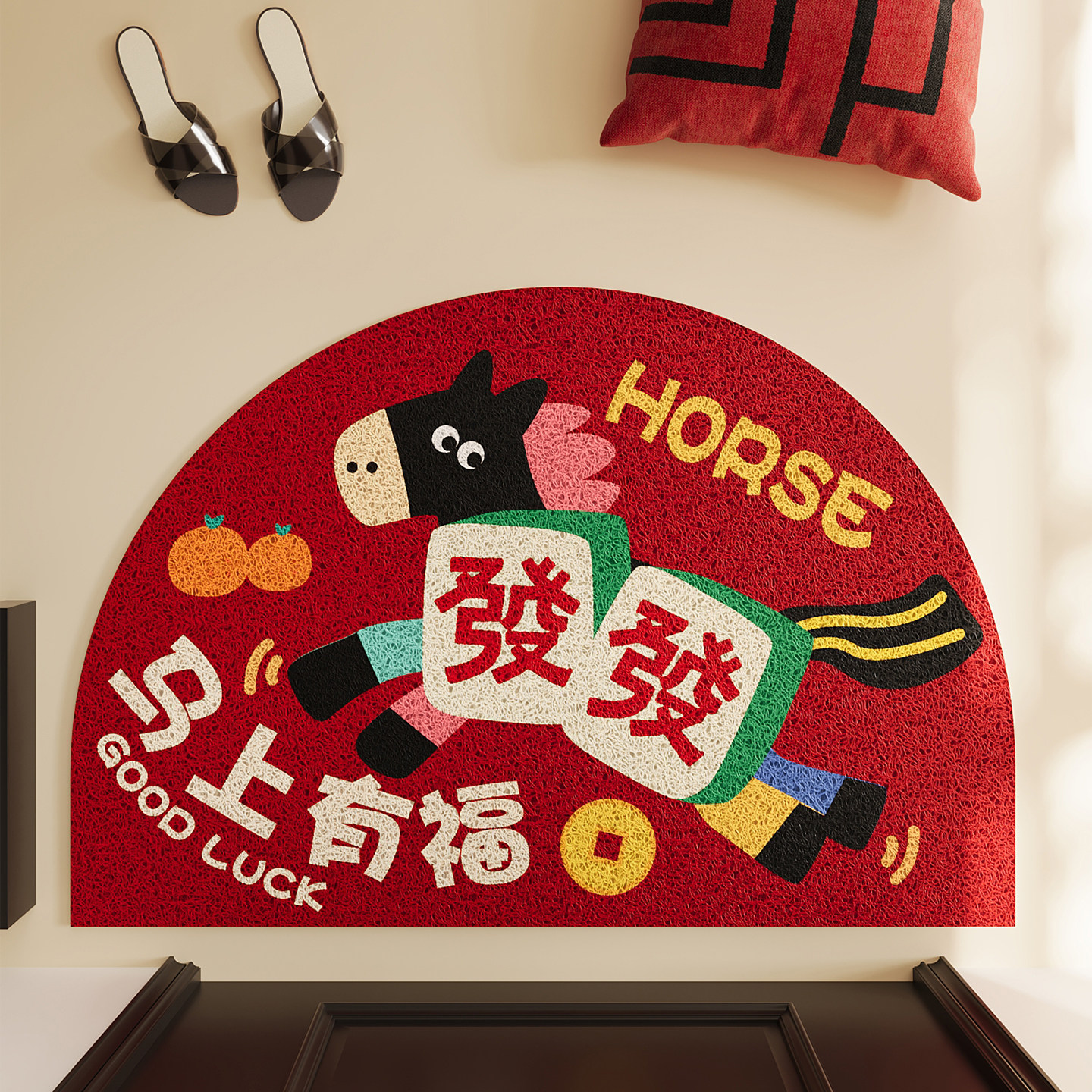 📚 红色卡通马年丝圈入户门地垫玄关大门口半圆脚垫防滑除尘门垫地毯
