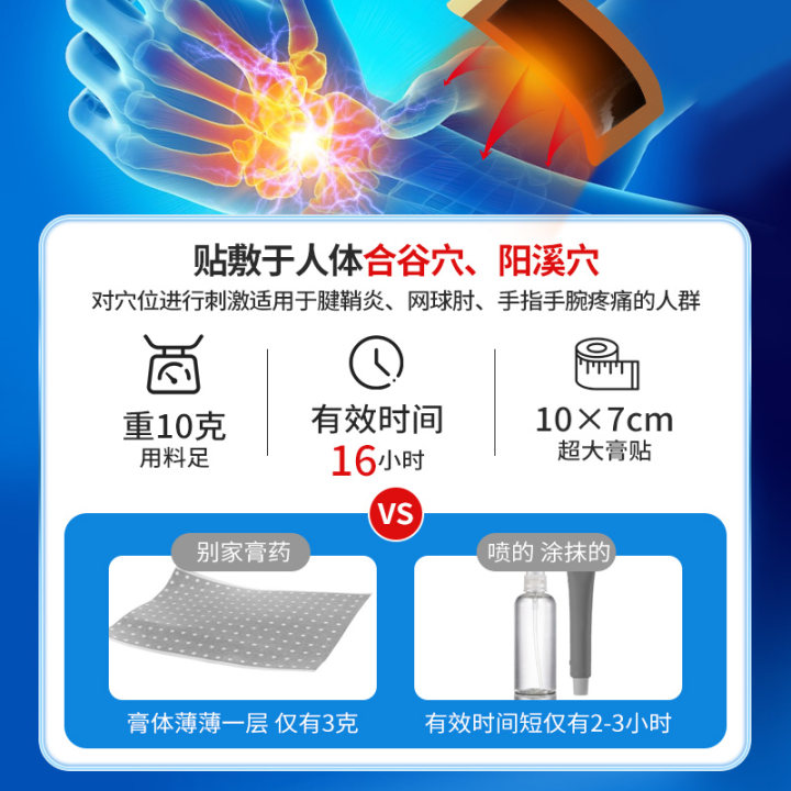 🔥特别值得一提的是,这款产品对于腱鞘炎、手腕疼痛等症状有很好的缓解作用。而且,它的使用非常方便,只需要轻轻一贴,就可以享受舒适的呵护。