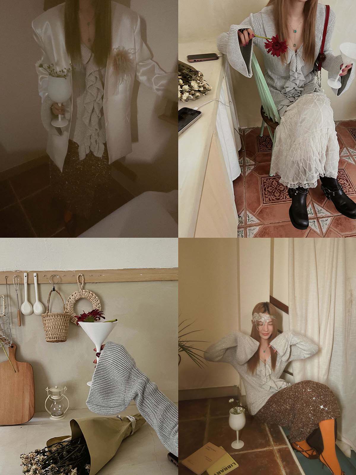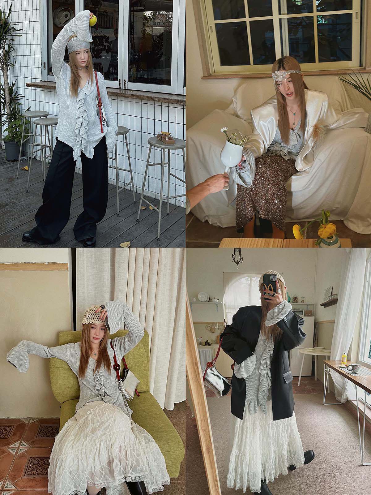 📚 MOERSHOP 波多黎浪漫“法式美颜”银丝特种纱木耳开衫长袖打底衫
