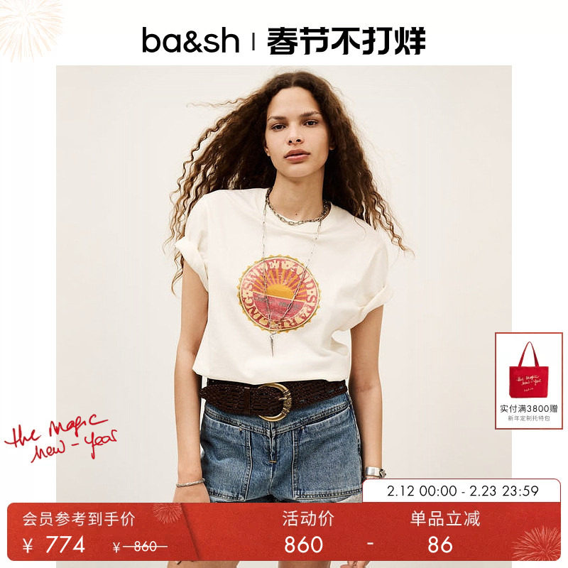 📚 bash春季复古做旧印花法式休闲宽松棉质米白T恤短袖上衣1E25BARE
