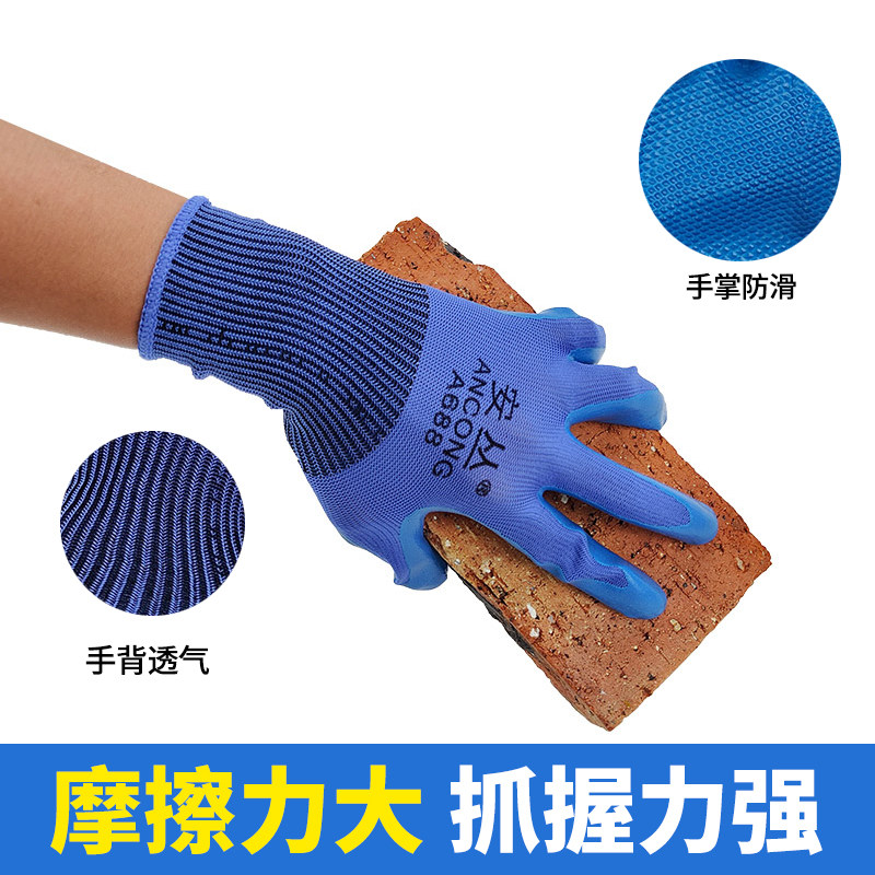 📚 安丛劳保耐磨手套A688防滑透气工作手套乳胶物理压纹工地涂胶手套