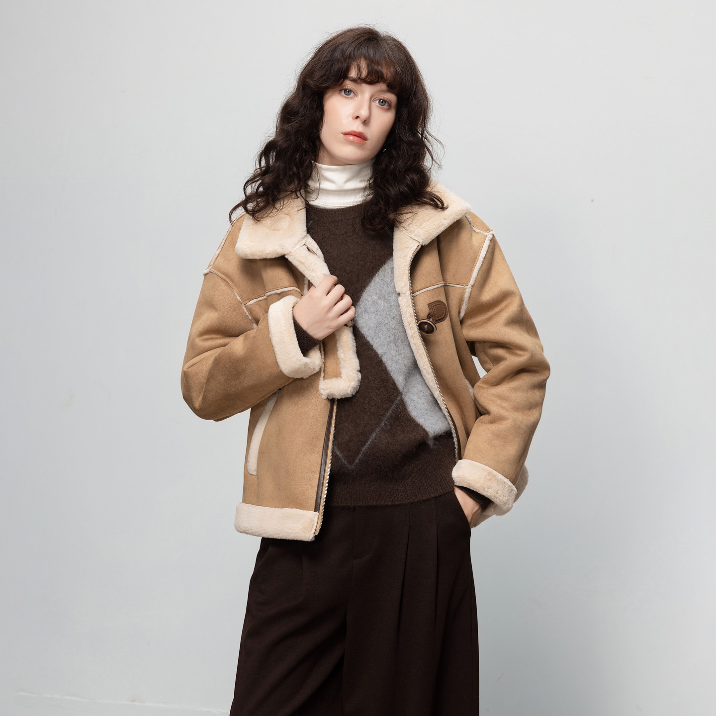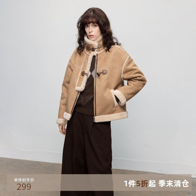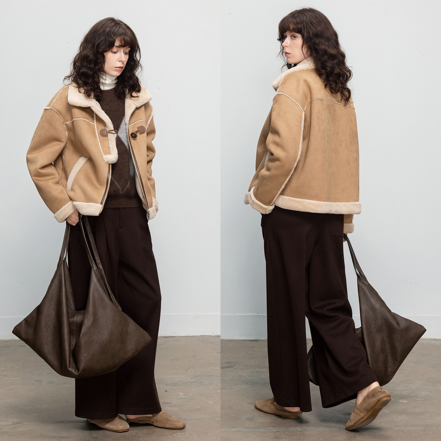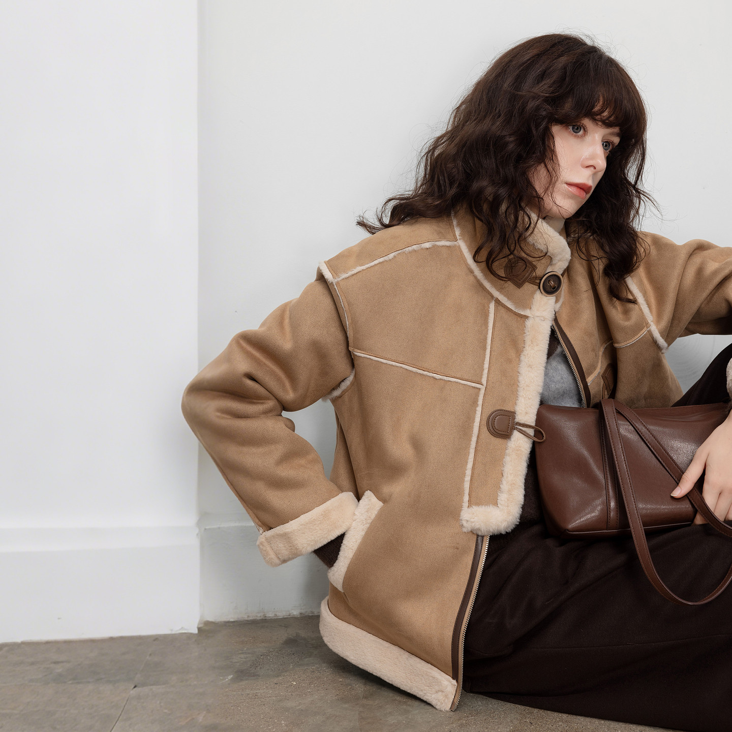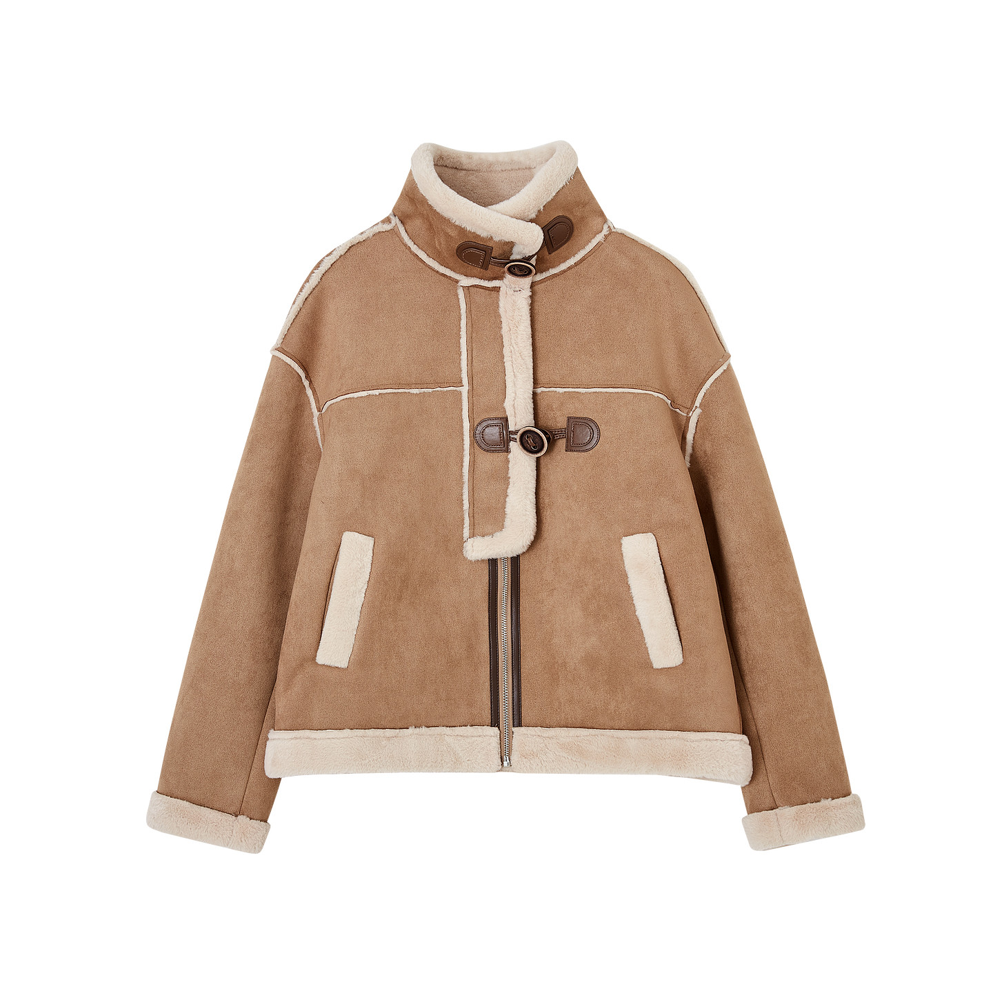 📚 德玛纳复古风麂皮绒翻领外套女25冬季新款毛绒拼接PU扣袢保暖上衣