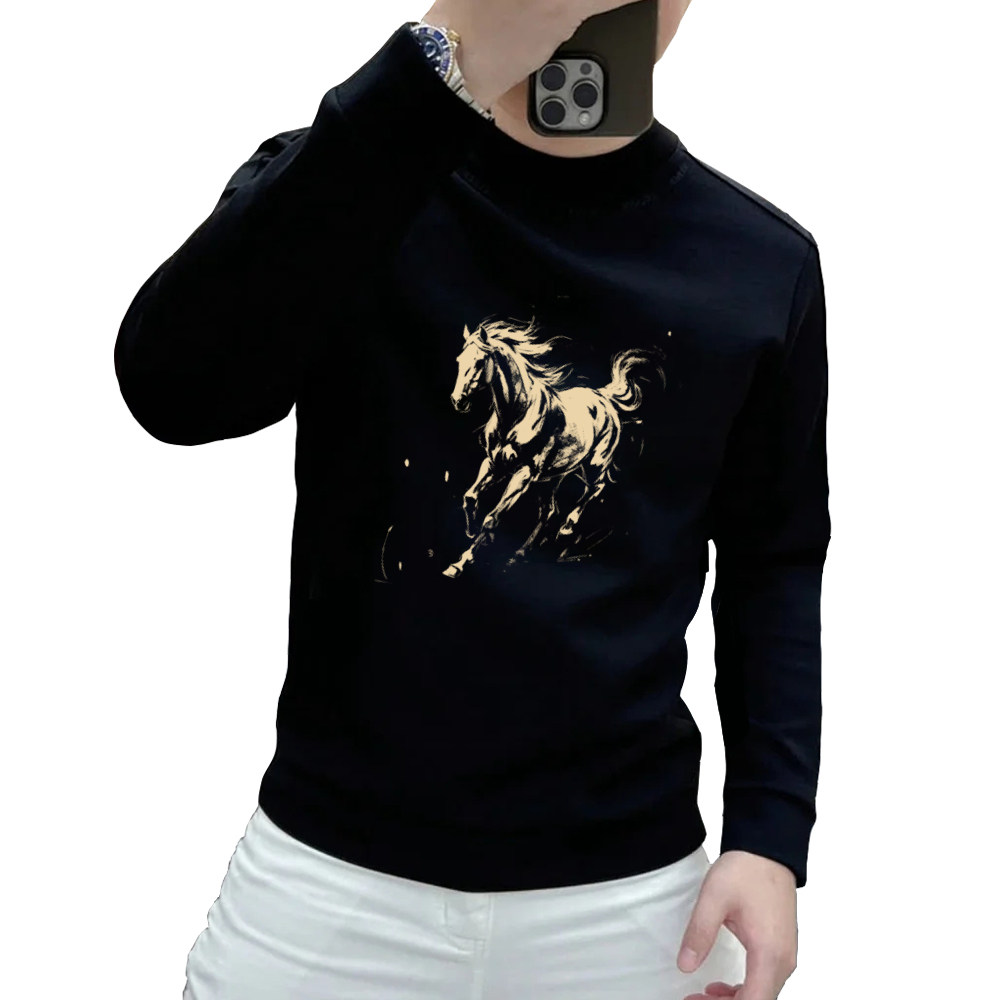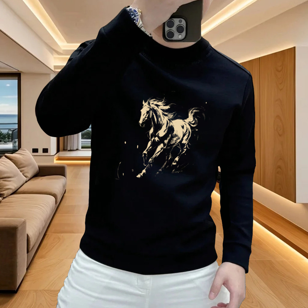 📚 秋冬加绒潮牌时尚圆领卫衣男士青年马图案印花长袖打底衫上衣男装