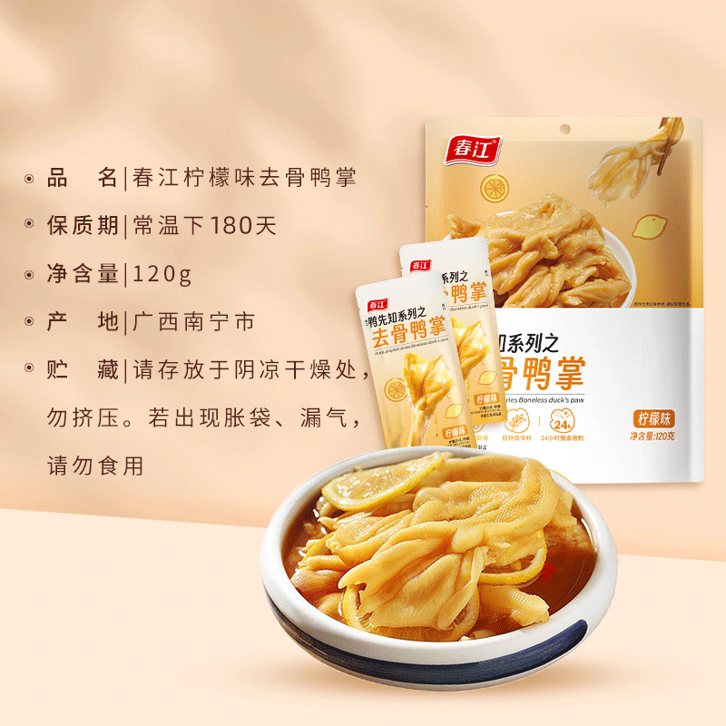 📚 春江无骨鸭掌柠檬酸辣120g独立包装去骨广西鸭爪鸭肉零食卤味小吃
