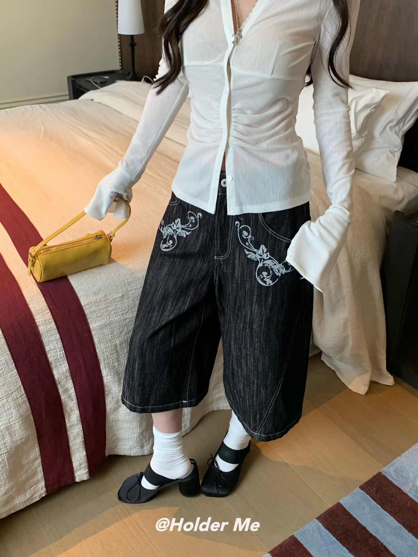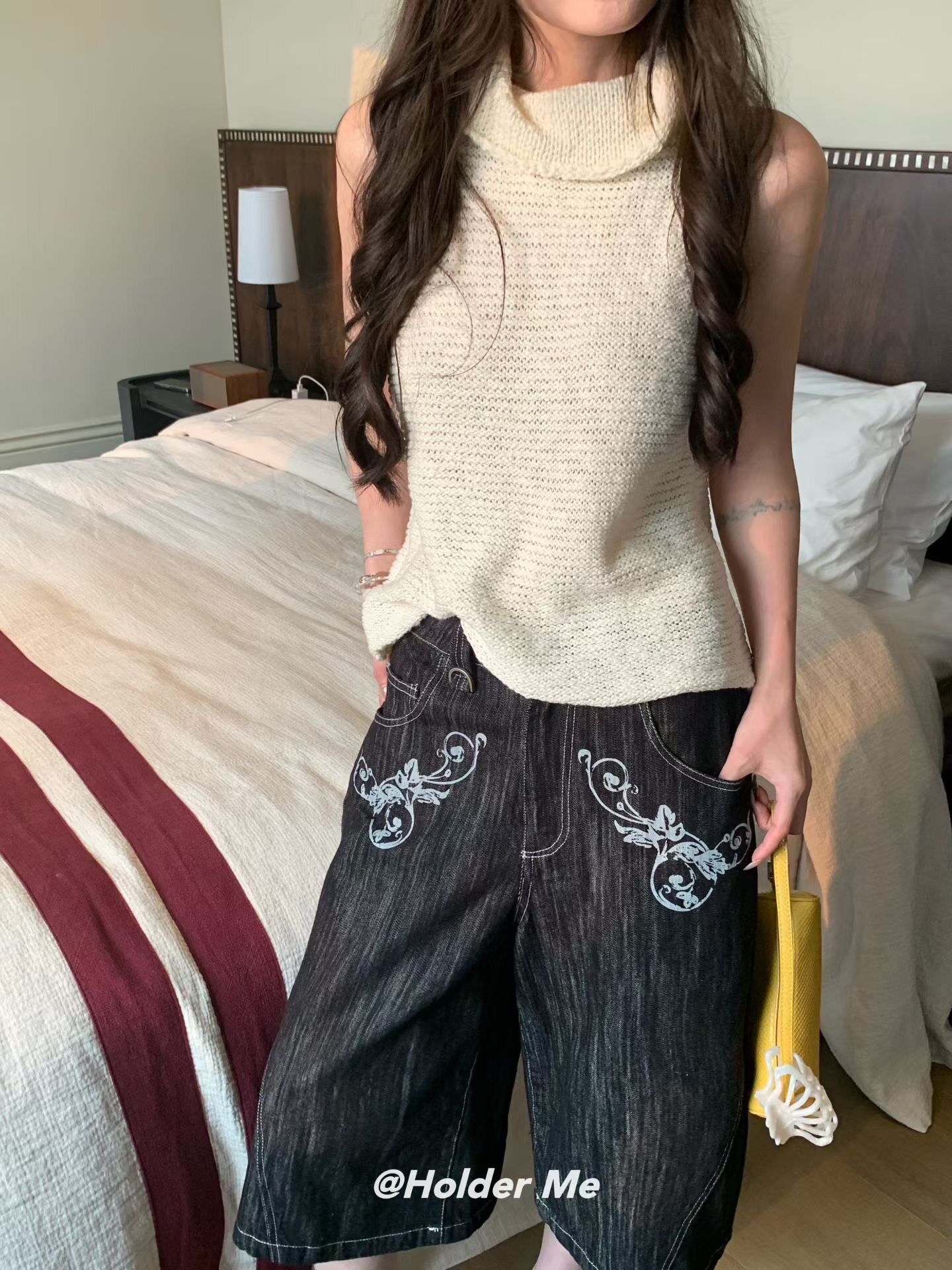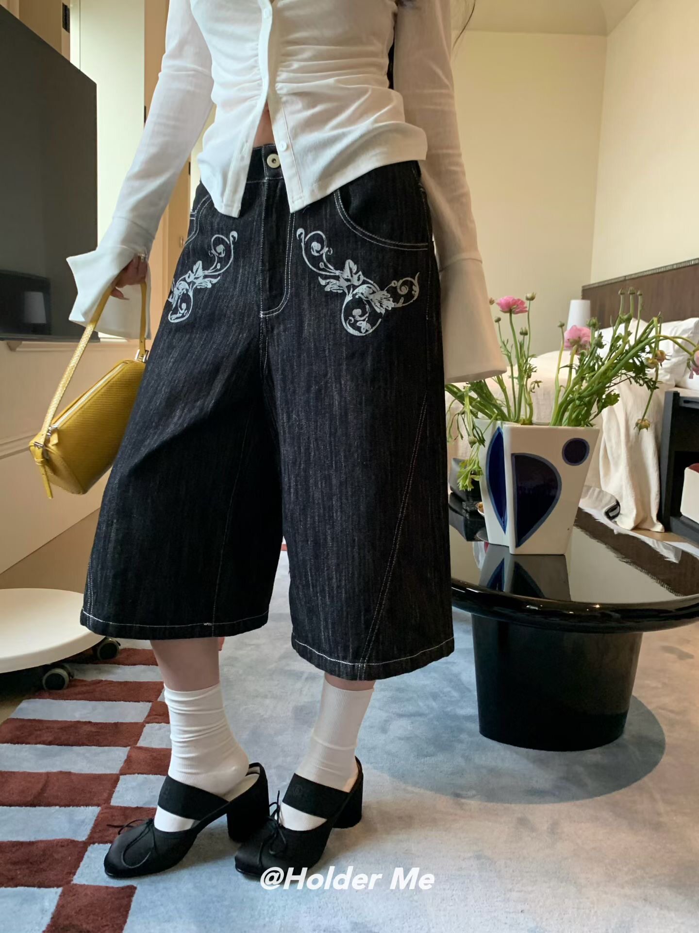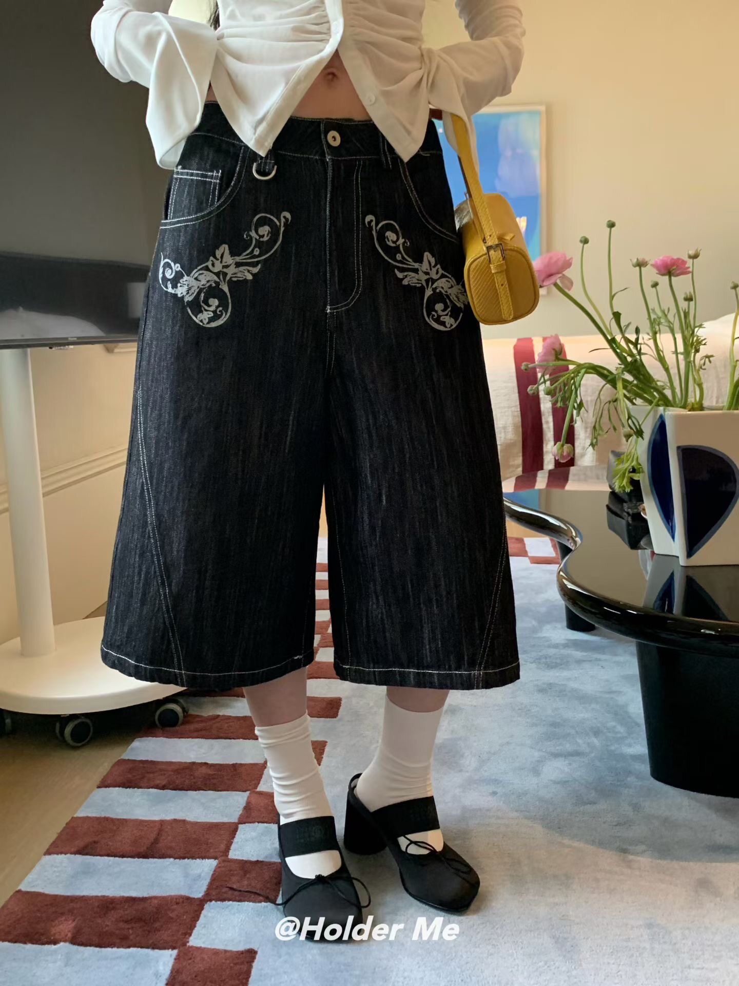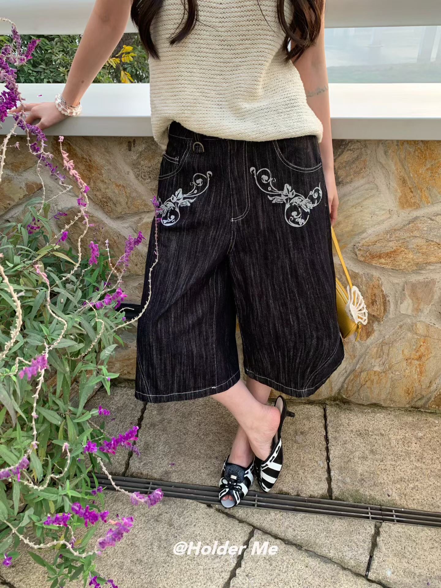 📚 HOLDER ME 复古印花阔腿七分牛仔裤女 2026春季宽松显瘦中裤 8013